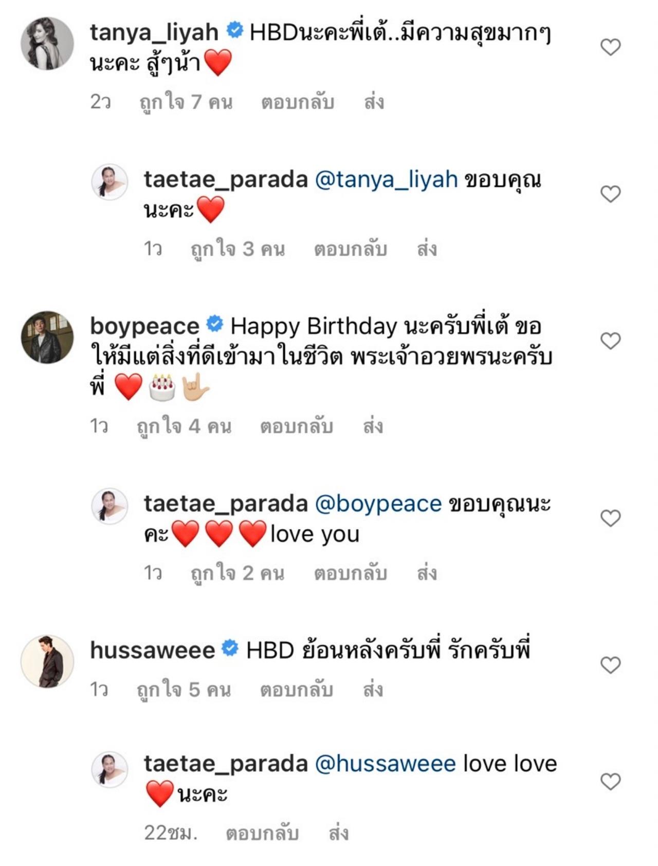 งานนี้พี่น้องในวงการบันเทิง รวมไปถึงหลายคนที่ติดตาม เตเต้ ก็ได้เข้ามาคอมเมนต์ให้กำลังใจ พร้อมกับร่วมอวยพรวันเกิดให้กับ เต้ เป็นจำนวนมาก.