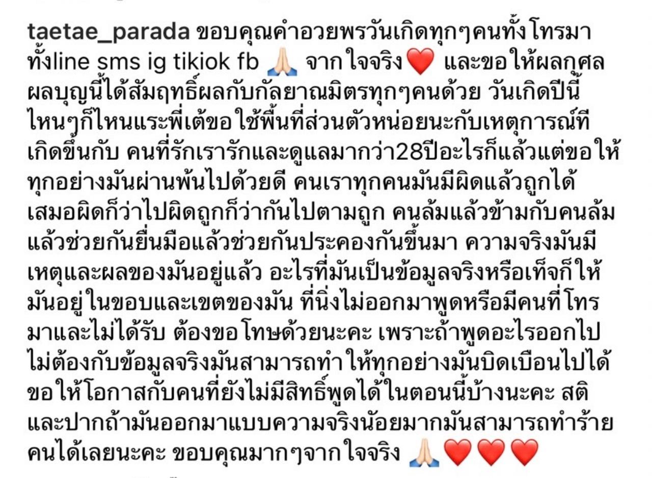 "ขอบคุณคำอวยพรวันเกิดทุกๆ คน ทั้งโทรมา ทั้ง line sms ig tikiok fb จากใจจริง และขอให้ผลกุศลผลบุญนี้ได้สัมฤทธิ์ผลกับกัลยาณมิตรทุกๆ คนด้วย วันเกิดปีนี้ไหนๆ ก็ไหนๆ แระ พี่เต้ขอใช้พื้นที่ส่วนตัวหน่อยนะกับเหตุการณ์ที่เกิดขึ้นกับคนที่เรารักและดูแลมากว่า 28 ปี อะไรก็แล้วแต่ขอให้ทุกอย่างมันผ่านพ้นไปด้วยดี