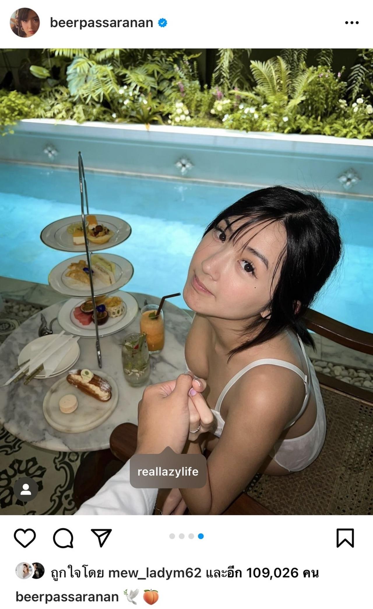 แต่เมื่อเลื่อนไปที่ภาพสุดท้ายก็ทำเอาหนุ่มๆ ใจเจ็บ เมื่อสาวเบียร์ลงรูปจับมือกับ ท็อป เลซีล็อกซี พร้อมกับแท็กไอจีฝ่ายชาย เหมือนเป็นการเปิดตัวคบกันอย่างเป็นทางการของเบียร์และท็อป