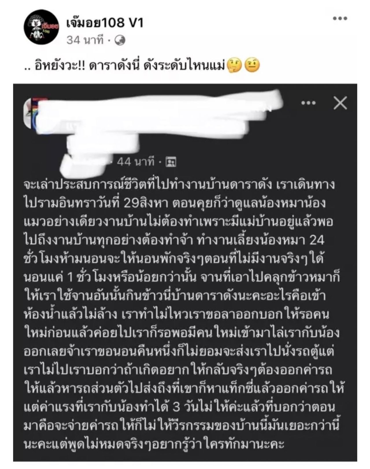 "จะเล่าประสบการณ์ชีวิตที่ไปทำงานบ้านดาราดัง เราเดินทางไปรามอินทรา วันที่ 29 สิงหา ตอนคุยก็ว่าดูแลน้องหมาน้องแมวอย่างเดียว งานบ้านไม่ต้องทำเพราะมีแม่บ้านอยู่แล้ว