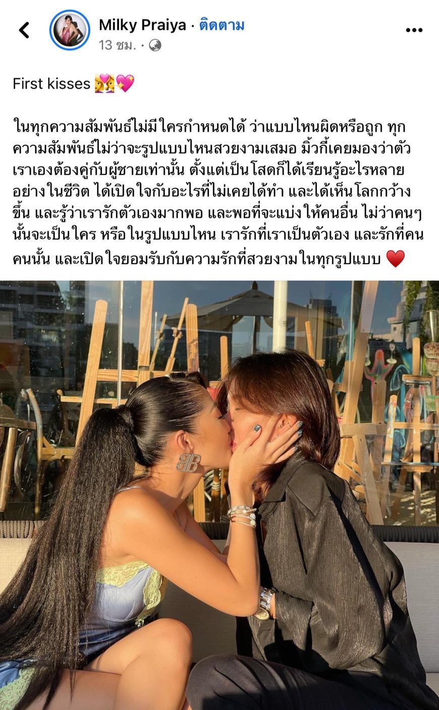 โดยระบุข้อความดังกล่าวว่า "First kisses ในทุกความสัมพันธ์ไม่มีใครกำหนดได้ ว่าแบบไหนผิดหรือถูก ทุกความสัมพันธ์ไม่ว่าจะรูปแบบไหนสวยงามเสมอ มิ้วกี้เคยมองว่าตัวเราเองต้องคู่กับผู้ชายเท่านั้น ตั้งแต่เป็นโสดก็ได้เรียนรู้อะไรหลายอย่างในชีวิต ได้เปิดใจกับอะไรที่ไม่เคยได้ทำ และได้เห็นโลกกว้างขึ้น และรู้ว่าเรารักตัวเองมากพอ และพอที่จะแบ่งให้คนอื่น ไม่ว่าคนๆนั้นจะเป็นใคร หรือในรูปแบบไหน เรารักที่เราเป็นตัวเอง และรักที่คนคนนั้น และเปิดใจยอมรับกับความรักที่สวยงามในทุกรูปแบบ"