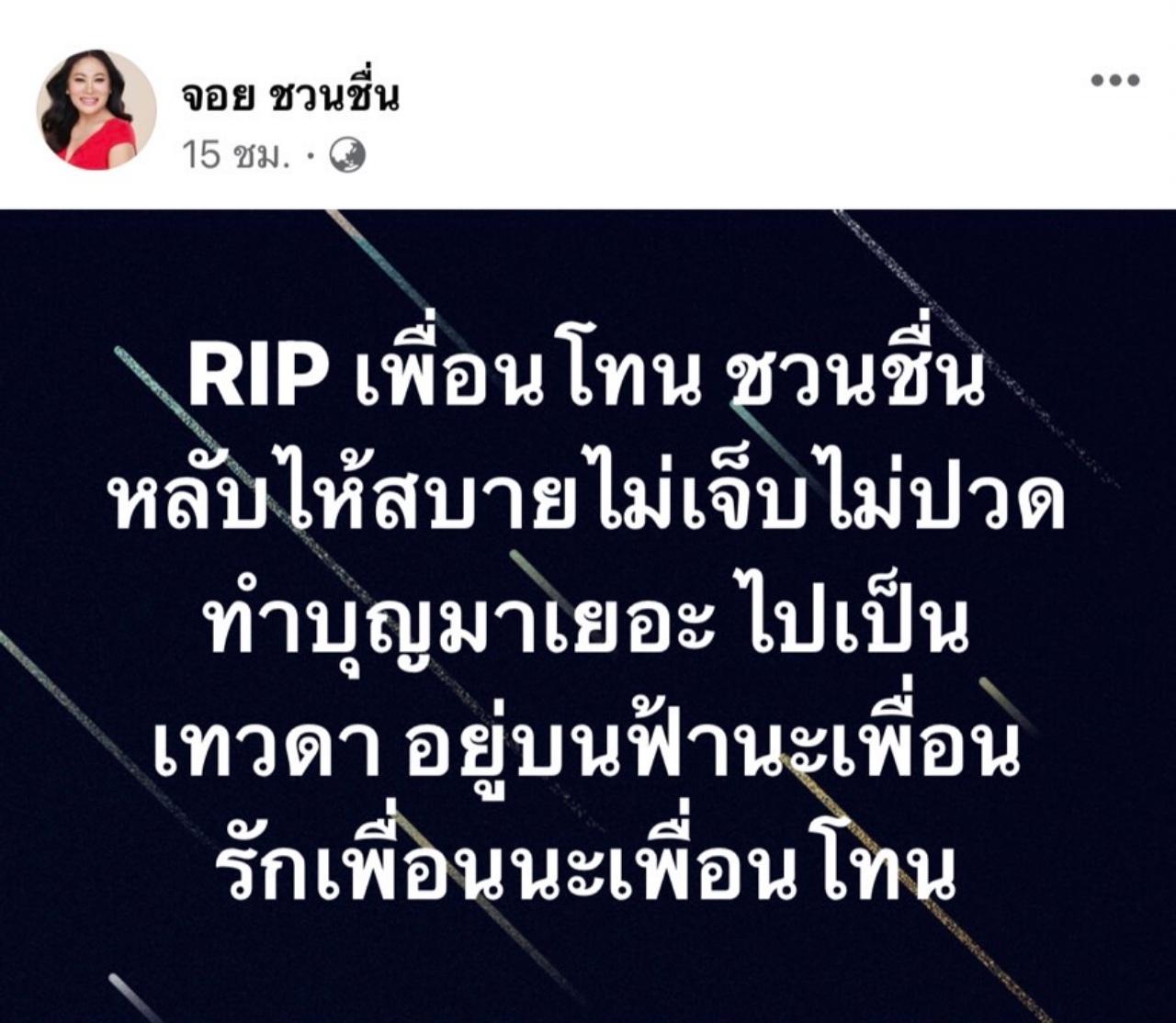 และ จอย ชวนชื่น ได้โพสต์ว่า "RIP เพื่อนโทน ชวนชื่น หลับไห้สบายไม่เจ็บไม่ปวด ทำบุญมาเยอะ ไปเป็นเทวดา อยู่บนฟ้านะเพื่อน รักเพื่อนนะเพื่อนโทน"