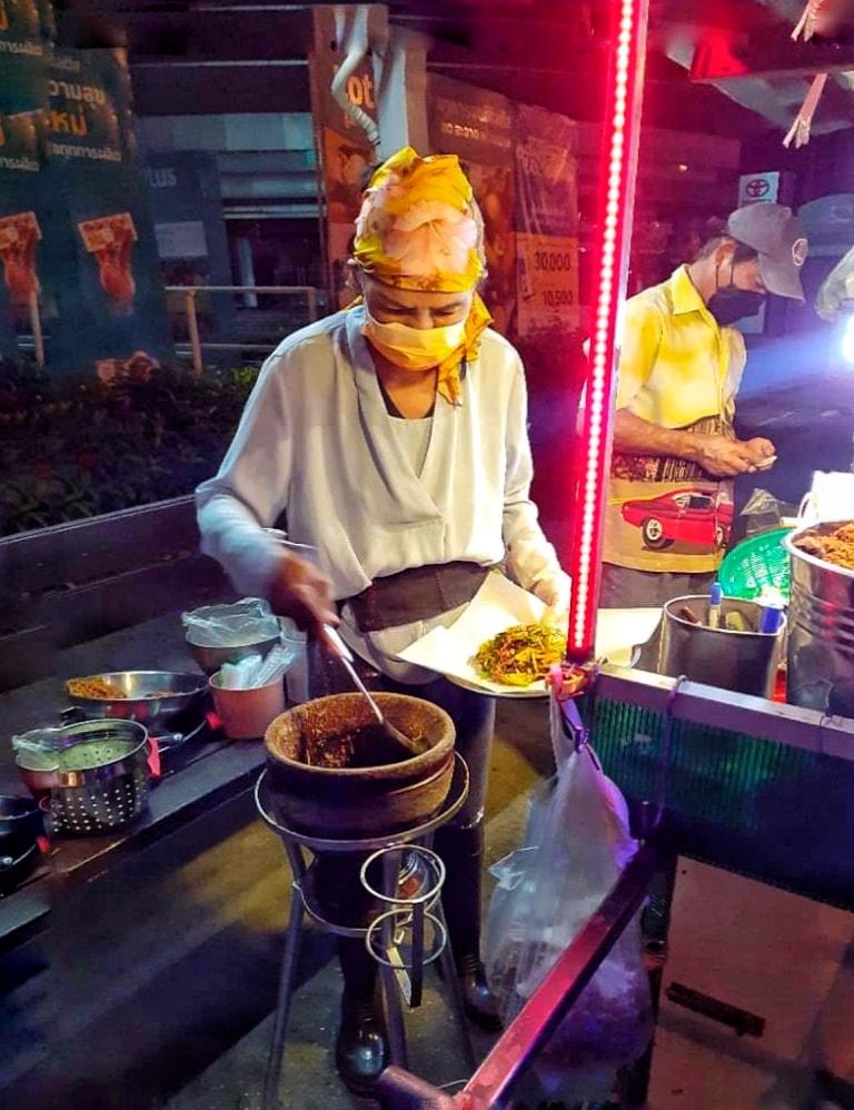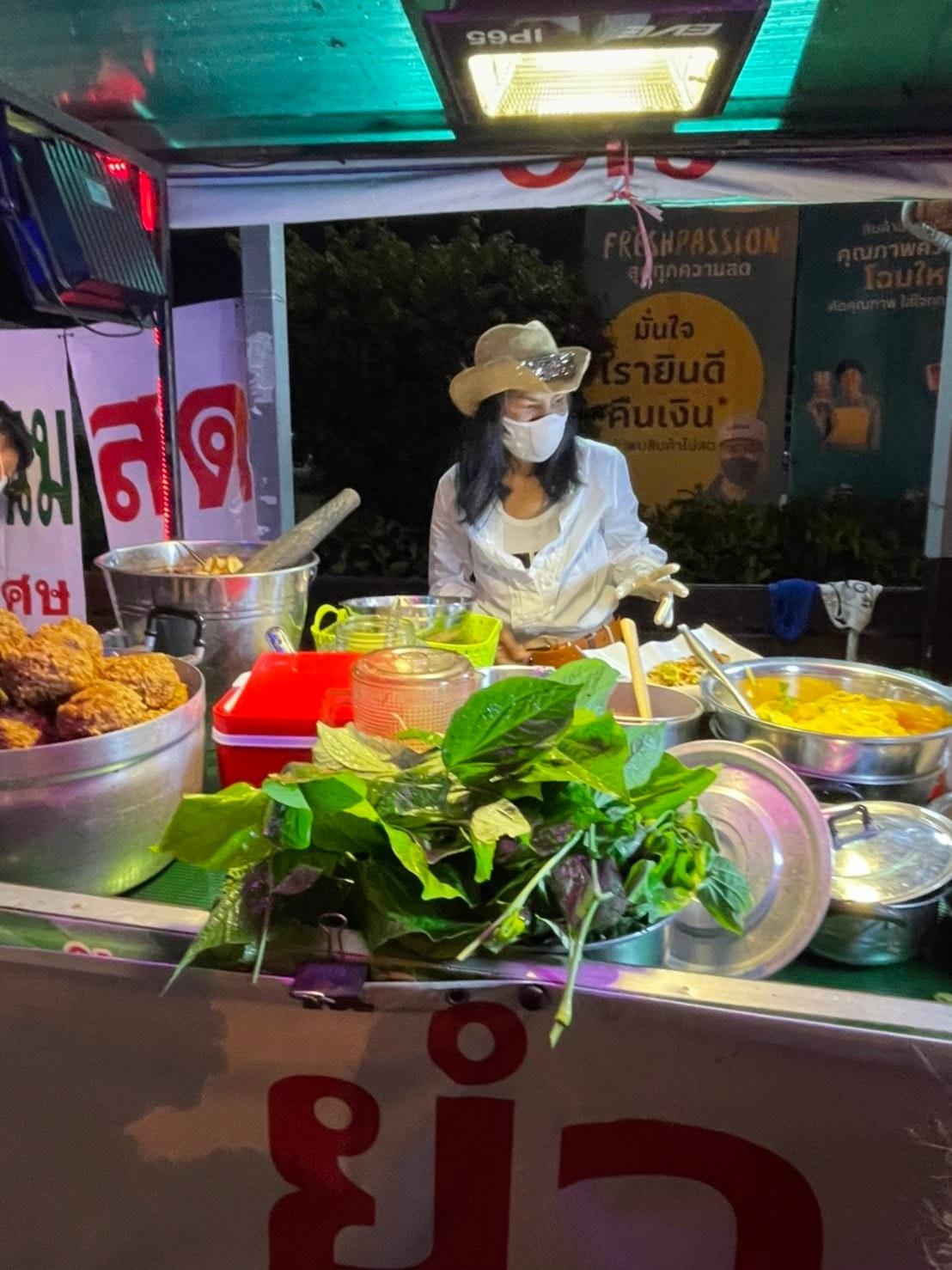 "ก็ขายมาตั้งแต่ช่วงเข้าวงการ พี่น้องในครอบครัวขายยำแหนมหมด บางทีเมื่อก่อนมันจะหาบ 6-7 หาบทุกคนขายหมด เวลาตอนเย็นจะมาคุยกันแล้วว่าขายได้เท่าไร ก็สนุกดีค่ะ ตอนนี้เราขายอยู่ที่พุทธมณฑลสาย 4 อยู่หน้าป้ายรถเมล์ แต่ถ้าไปตั้งเร็วๆ เค้าไม่ให้ตั้ง นอกจากว่าประมาณทุ่มครึ่งถึงสี่ทุ่มถึงจะตั้งได้ แต่ตอนนี้คนมันก็มีไม่เหมือนเดิมแล้ว เพราะเค้ารีบซื้อแล้วก็รีบไป"