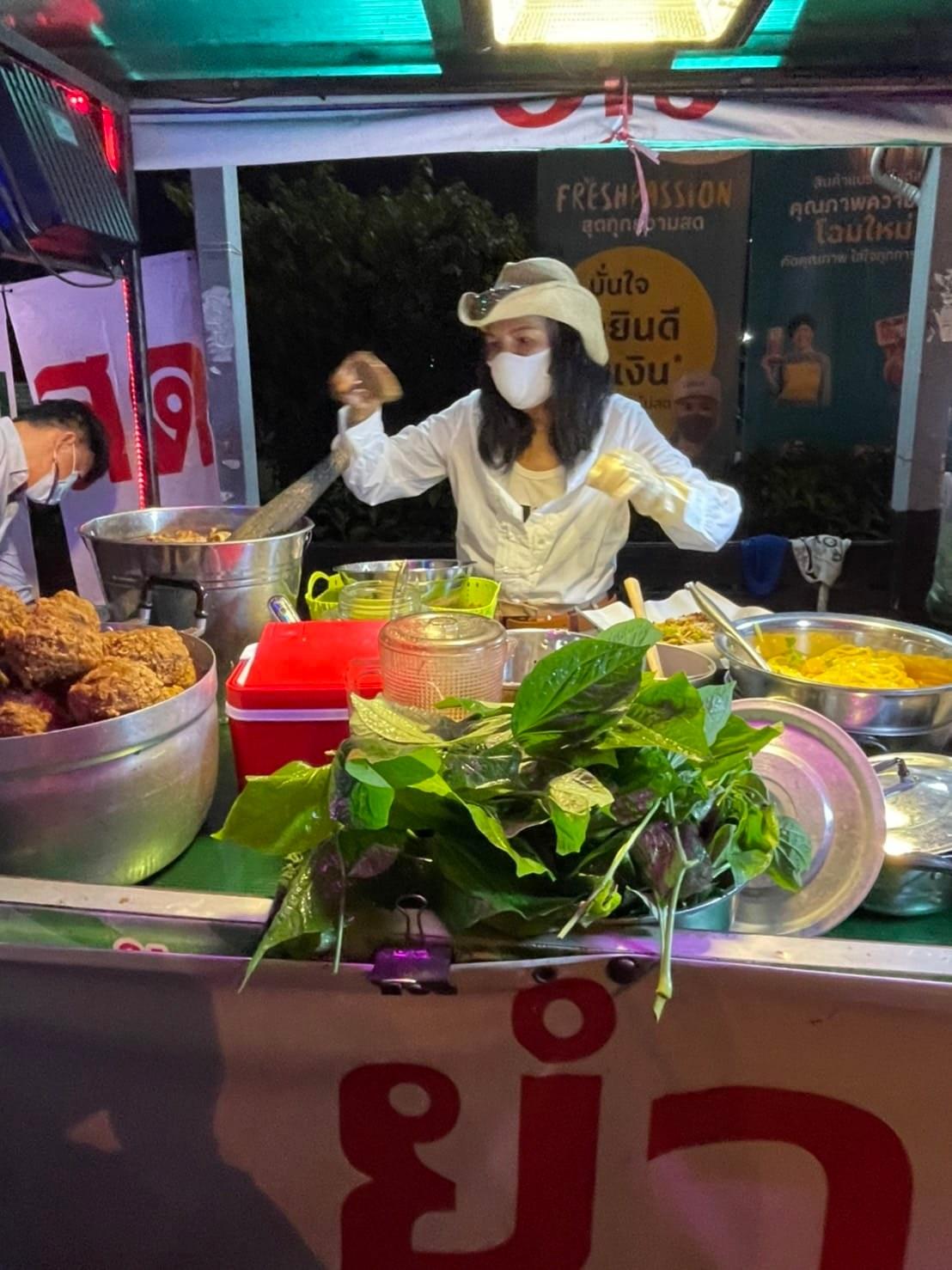 "ไม่หยุดค่ะหยุดไม่ได้ หยุดแล้วรายจ่ายมันก็มี ซึ่งเราก็จะเข็นรถไปขายตอนเวลาทุ่มนึง ซึ่งช่วงนั้นคนก็จะรีบซื้อรีบกลับ แต่มันขายไม่ดีเหมือนเมื่อก่อน บางวันลงทุนไป 4,000 ขายได้ 600 ซึ่งเราก็หยุดทำไม่ได้ เพราะมันมีรายจ่ายเยอะแยะมากมายเกี่ยวกับหมาแมว ซึ่งเงินจากรายได้ที่เราขายยำแหนมก็เอาไปอุทิศให้กับหมาแมวจรจัดหมดเป็นจำนวน 100 กว่าตัว ขายของเสร็จต้องไปหุงข้าวกระทะใหญ่ๆ ทอดหมูเค็ม และเอาไปให้เขากินช่วงตี 1-2 แถวป่าช้า"