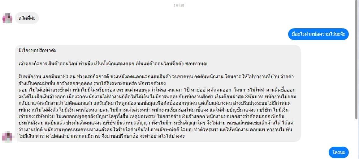 พนักงานทุกคนหมดหนทางแล้วค่ะ ใจร้ายใจดำเกินไป ภาพลักษณ์ดูดี ใจบุญ ทำตัวหรูหรา แต่ให้พนักงานลอยแพ หางานไม่ทัน หาทางไปต่อลำบาก ทุกคนมีภาระ จึงมาขอปรึกษาสื่อ จะทำอย่างไรได้บ้างค่ะ”