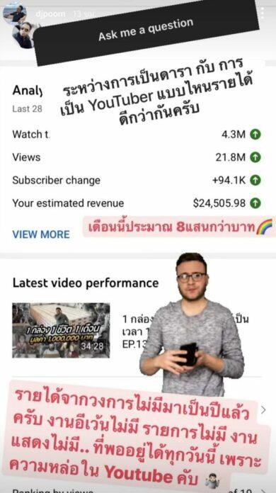และวันนี้เราจะพาไปเปิดรายได้การทำช่องยูทูบของ ดีเจภูมิ โดยเมื่อปีที่แล้วเจ้าตัวได้ออกมาโพสต์ไอจีสตอรี่ เพื่อเปิดโอกาสให้แฟนๆ ได้เข้ามาพูดคุย ซึ่งก็มีชาวเน็ตรายหนึ่งได้ตั้งคำถามว่า "ระหว่างการเป็นดารา กับ การเป็น YouTuber แบบไหนรายได้ดีกว่ากันครับ"