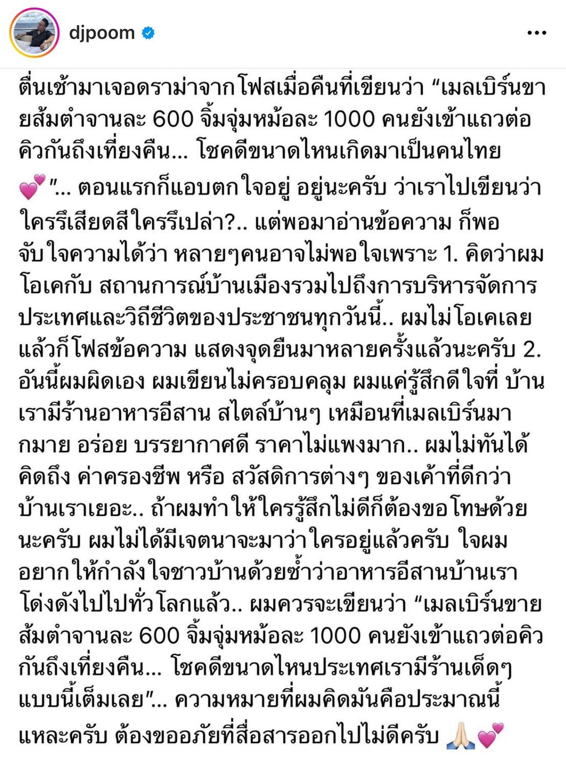 ถ้าผมทำให้ใครรู้สึกไม่ดีก็ต้องขอโทษด้วยนะครับ ผมไม่ได้มีเจตนาจะมาว่าใครอยู่แล้วครับ ใจผมอยากให้กำลังใจชาวบ้านด้วยซ้ำว่าอาหารอีสานบ้านเราโด่งดังไปไปทั่วโลกแล้ว.. ผมควรจะเขียนว่า “เมลเบิร์นขายส้มตำจานละ 600 จิ้มจุ่มหม้อละ 1000 คนยังเข้าแถวต่อคิวกันถึงเที่ยงคืน… โชคดีขนาดไหนประเทศเรามีร้านเด็ดๆแบบนี้เต็มเลย… ความหมายที่ผมคิดมันคือประมาณนี้แหละครับ ต้องขออภัยที่สื่อสารออกไปไม่ดีครับ"