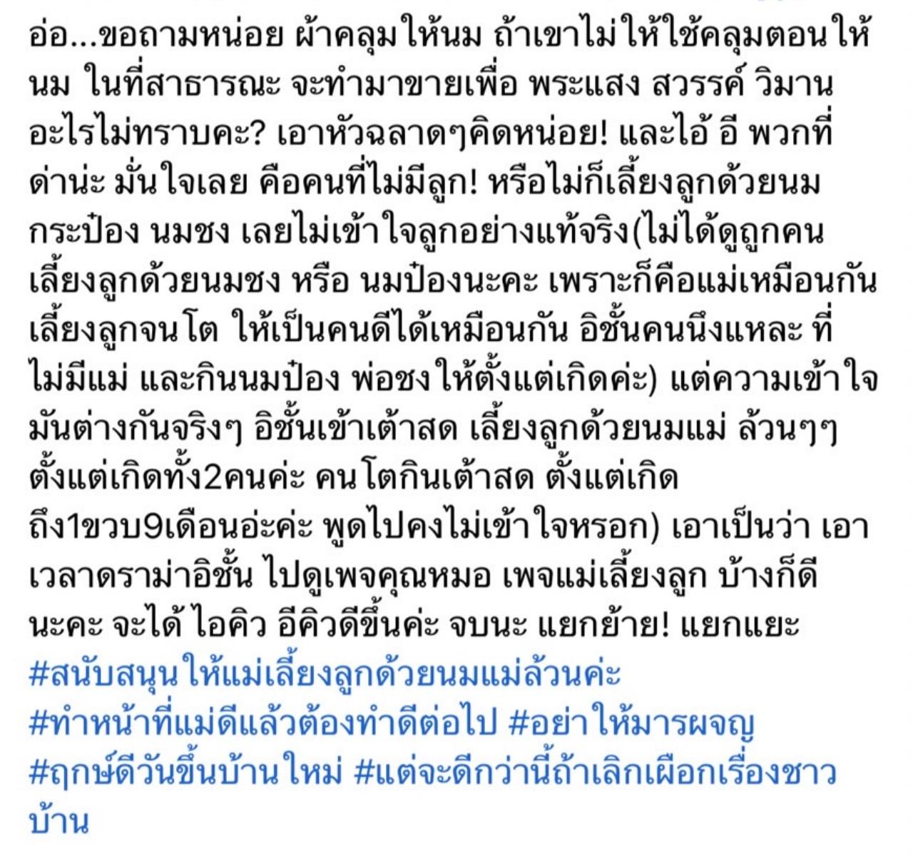 แหกตาดูก่อนด่าซะบ้าง อี ไอ้ สมองกลวง (*ถ้าวันนั้นไม่ให้กิน ปล่อยให้ลูกร้องหิว เชื่อม่ะ ว่าก็ต้องมีดราม่า ทำไมไม่เอานมให้ลูกกิน เป็นแม่ประสาอะไร? บลาๆๆๆ เชื่อสิ คนจะดราม่า ทำอะไรก็ดราม่า) อ่อ...ขอถามหน่อย ผ้าคลุมให้นม ถ้าเขาไม่ให้ใช้คลุมตอนให้นม ในที่สาธารณะ จะทำมาขายเพื่อ พระแสง สวรรค์ วิมานอะไรไม่ทราบคะ? เอาหัวฉลาดๆคิดหน่อย!