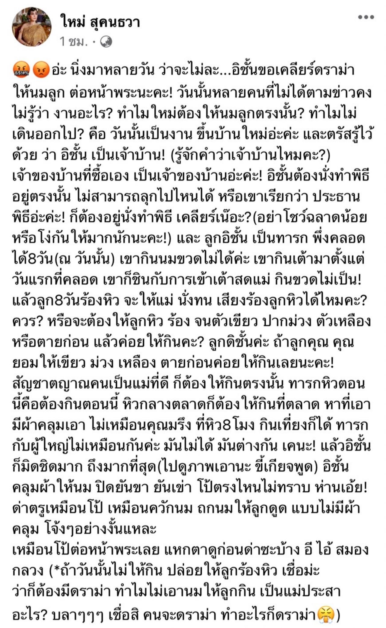 "อ่ะ นิ่งมาหลายวัน ว่าจะไม่ละ...อิชั้นขอเคลียร์ดราม่า ให้นมลูก ต่อหน้าพระนะคะ! วันนั้นหลายคนที่ไม่ได้ตามข่าวคงไม่รู้ว่า งานอะไร? ทำไมใหม่ต้องให้นมลูกตรงนั้น? ทำไมไม่เดินออกไป? คือ วันนั้นเป็นงาน ขึ้นบ้านใหม่อ่ะค่ะ และตรัสรู้ไว้ด้วย ว่า อิชั้น เป็นเจ้าบ้าน! (รู้จักคำว่าเจ้าบ้านไหมคะ?) เจ้าของบ้านที่ซื้อเอง เป็นเจ้าของบ้านอ่ะค่ะ!