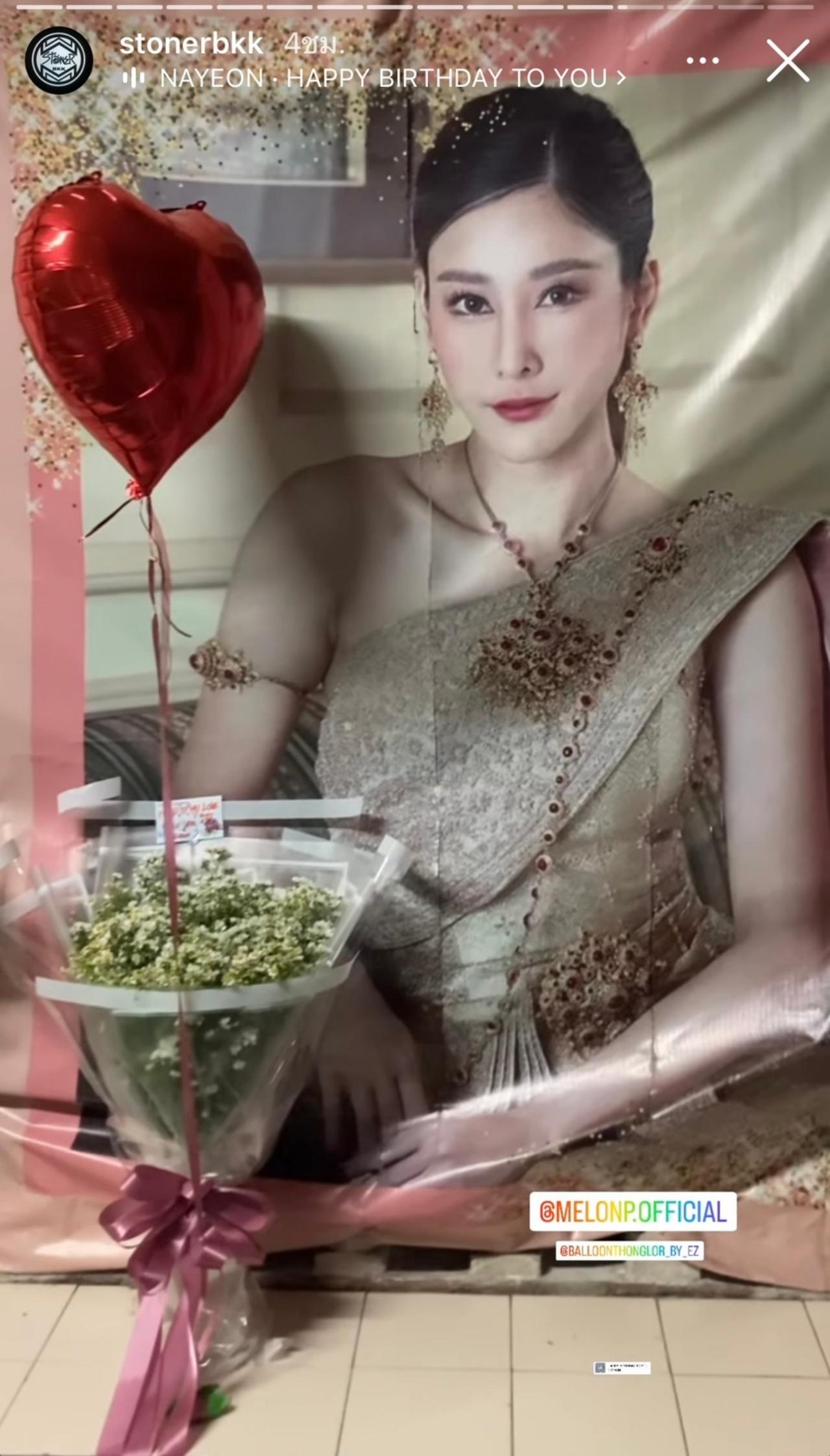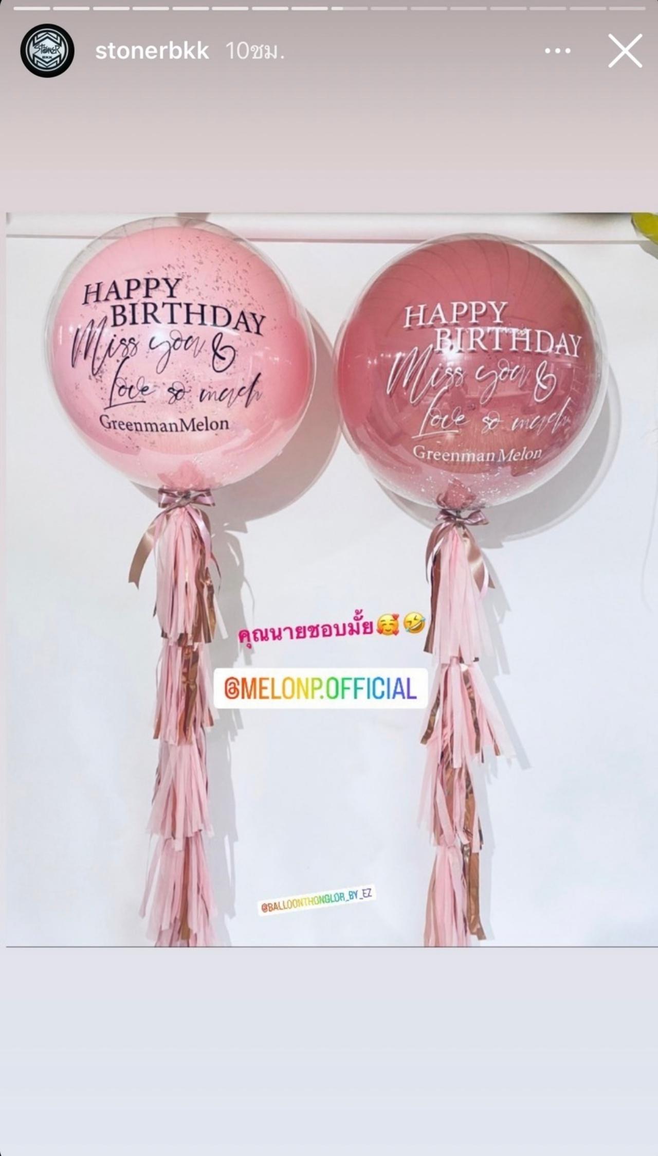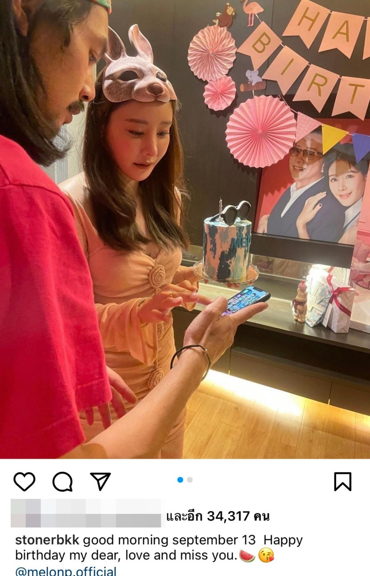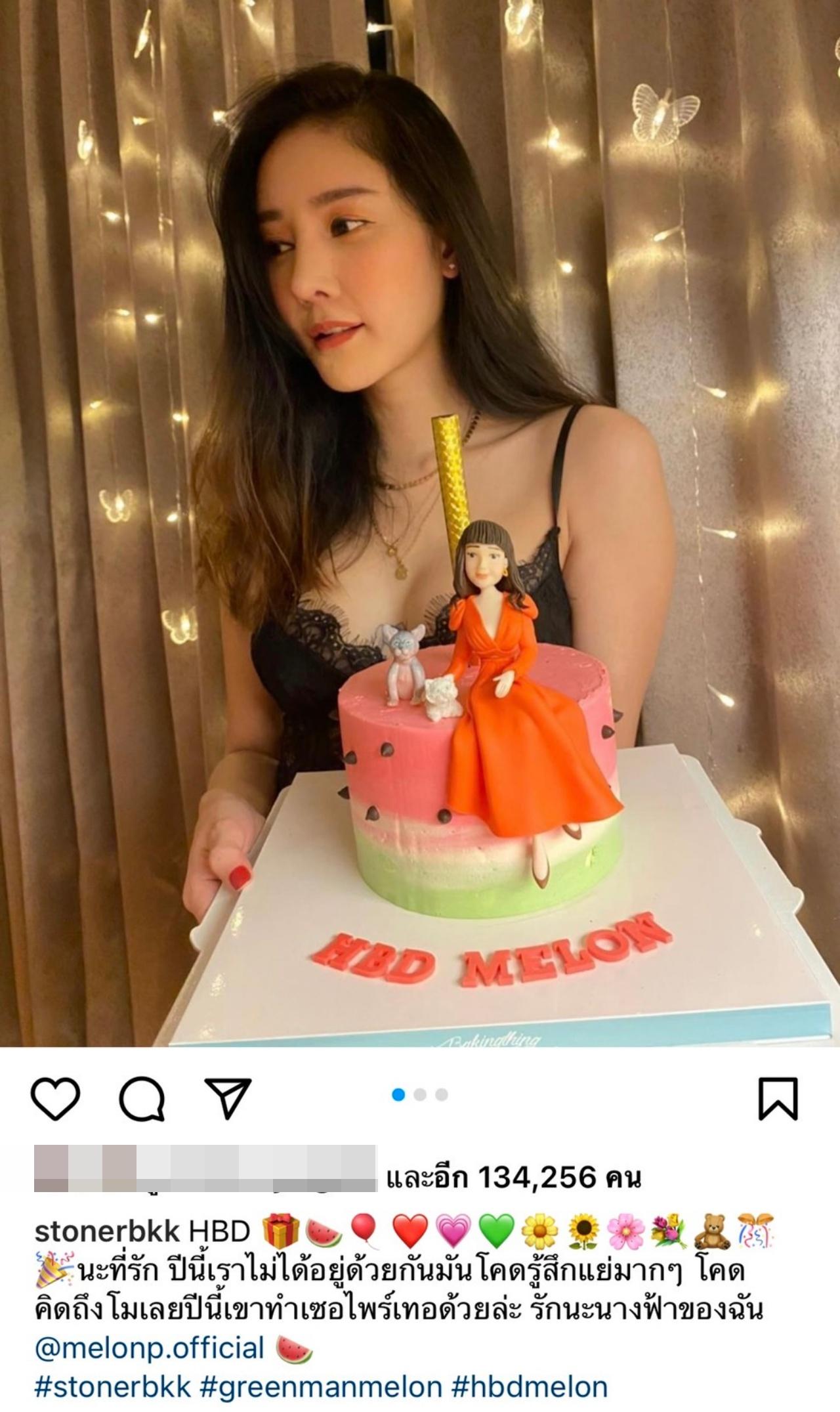 "HBD นะที่รัก ปีนี้เราไม่ได้อยู่ด้วยกันมันโคดรู้สึกแย่มากๆ โคดคิดถึงโมเลย ปีนี้เขาทำเซอไพร์เทอด้วยล่ะ รักนะนางฟ้าของฉัน @melonp.official"