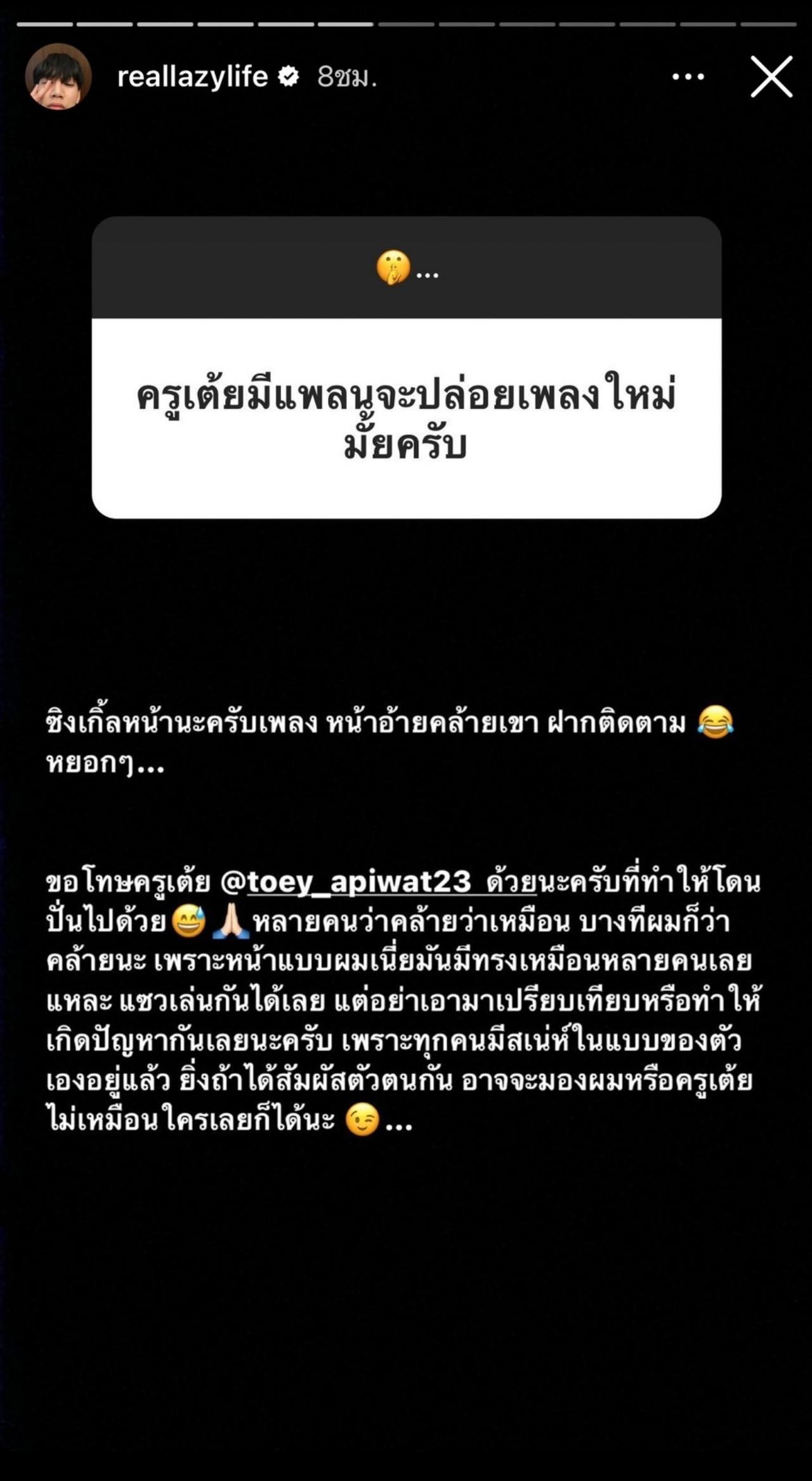 ขอโทษครูเต้ย @toey_apiwat23 ด้วยนะครับที่ทำให้โดนปั่นไปด้วย หลายคนว่าคล้าย ว่าเหมือน บางทีผมก็ว่าคล้ายนะ เพราะหน้าแบบผมเนี่ยมันมีทรงเหมือนหลายคนเลยแหละ แซวเล่นกันได้เลย