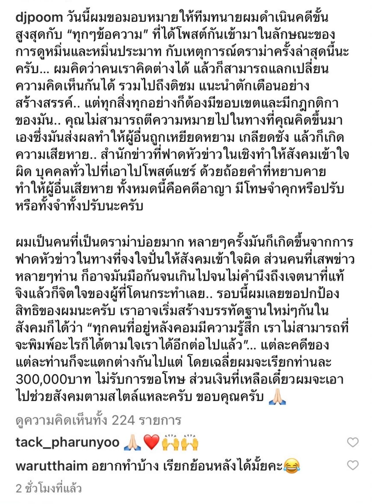 ล่าสุด ดีเจภูมิ ได้โพสต์คู่กับทนาย พร้อมเขียนข้อความว่า จะดำเนินคดีขั้นสูงสุดกับทุกข้อความที่หมิ่นประมาท เพื่อปกป้องสิทธิของตัวเอง โดยเฉลี่ยคนละ 3 แสนบาท โดยไม่รับคำขอโทษ