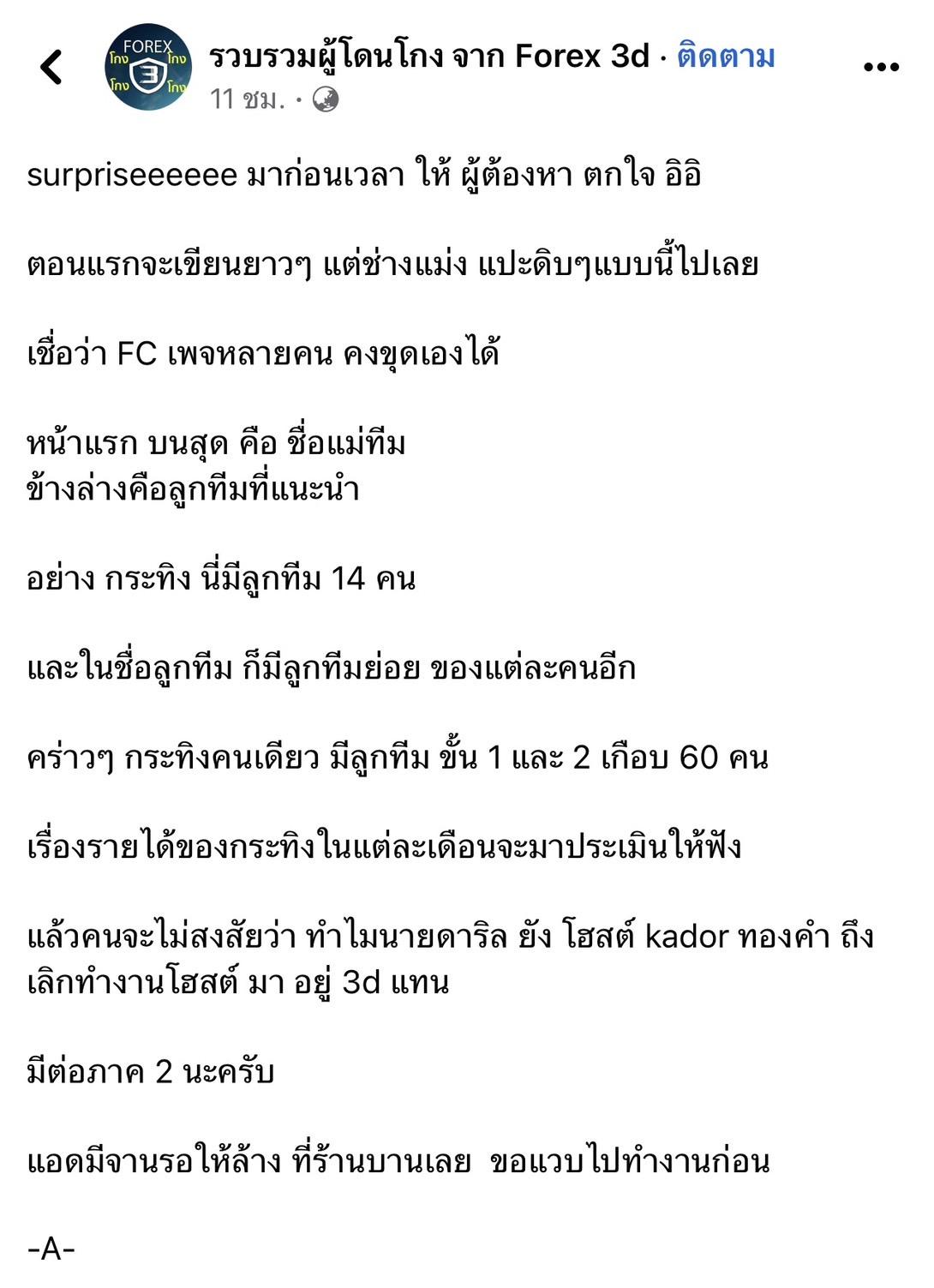 หลังจากที่เมื่อวานนี้ (13 กันยายน 2565) ทางเพจรวบรวมผู้โดนโกง จาก Forex 3d ได้ออกมาเปิดเผยข้อมูลว่า มีพระเอกดังช่อง 3 เป็นหนึ่งในแม่ทีมในคดี Forex 3d และยังมีลูกข่าย 14 คน และมีดาราช่อง 3 อีกหนึ่งคน ที่มีลูกข่าย 17 คน