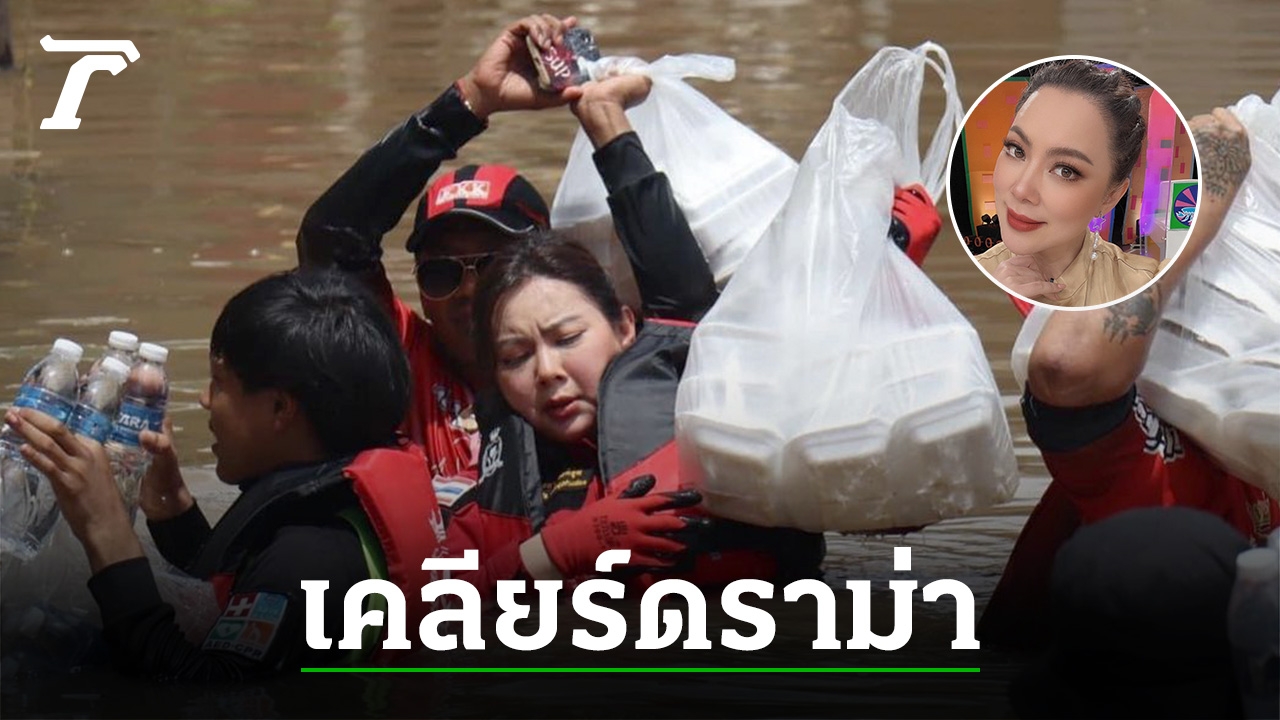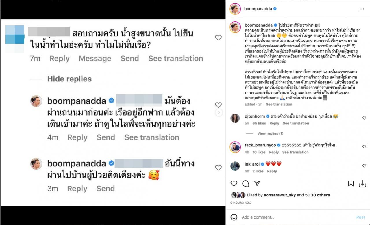 ก่อนจะโพสต์ภาพแคปข้อความดังกล่าวลงในไอจีส่วนตัว พร้อมทั้งเขียนข้อความชี้แจงแบบยาวๆ ว่า “ไปช่วยคนก็มีดราม่าเนอะ! หลายคนเห็นภาพลงน้ำสูงท่วมอกแล้วถามเยอะมากว่า ทำไมไม่นั่งเรือ ลงไปในน้ำทำไม 555 คือคนทำไม่พูด คนพูดไม่ได้ทำไง ดูไลฟ์การทำงานวันนั้นตลอดจะไม่ถามแบบนี้แน่นอน พวกเรานั่งเรือขนของมา พอมาถุงจุดนึงเราต้องจอดเรือขนของไปอีกฟาก เพราะมีถนนกั้น (รูปที่ 5) เพื่อเอาของไปให้บ้านผู้ป่วยติดเตียง ซึ่งระหว่างทางนั้นถ้ามีเจอผู้สูงอายุเราก็จะแจกข้าวไปตามทางพร้อมส่งกำลังใจ พอลุยถึงบ้านนั้นจบเราก็ต้องกลับมาข้ามถนนขึ้นเรือต่อ