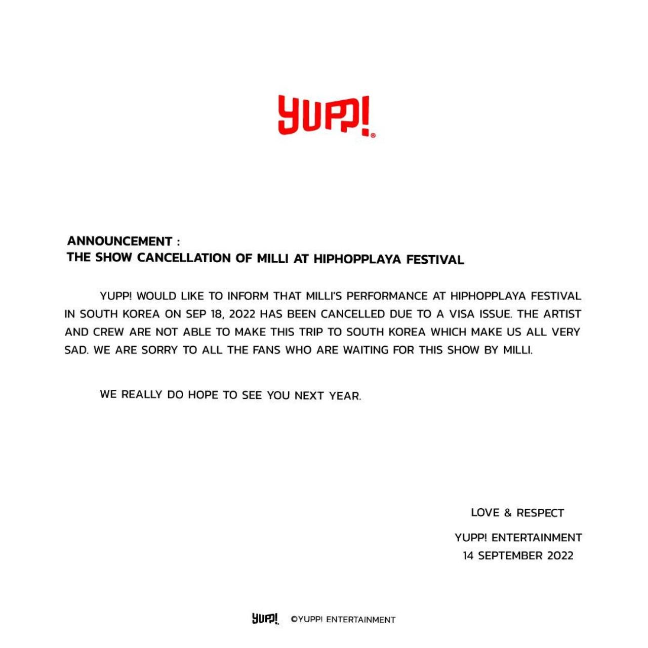 การแสดงคอนเสิร์ตของมิลลิ (MILLI) ดนุภา คณาธีรกุล ในงานเทศกาลดนตรี Hiphopplaya Festival ที่ประเทศเกาหลีใต้ ที่จะจัดขึ้นในวันที่ 18 กันยายน 2022 นี้ ต้องถูกยกเลิกไปก่อน เนื่องจากปัญหาวีซ่า ที่ทำให้ศิลปินและทีมงานไม่สามารถเดินทางเข้าประเทศเกาหลีใต้ได้ โดยทางเรารู้สึกเสียใจและขอโทษแฟนๆ ที่รอรับชมการแสดงของ มิลลิ หวังว่าจะได้พบกันในโอกาสหน้า.