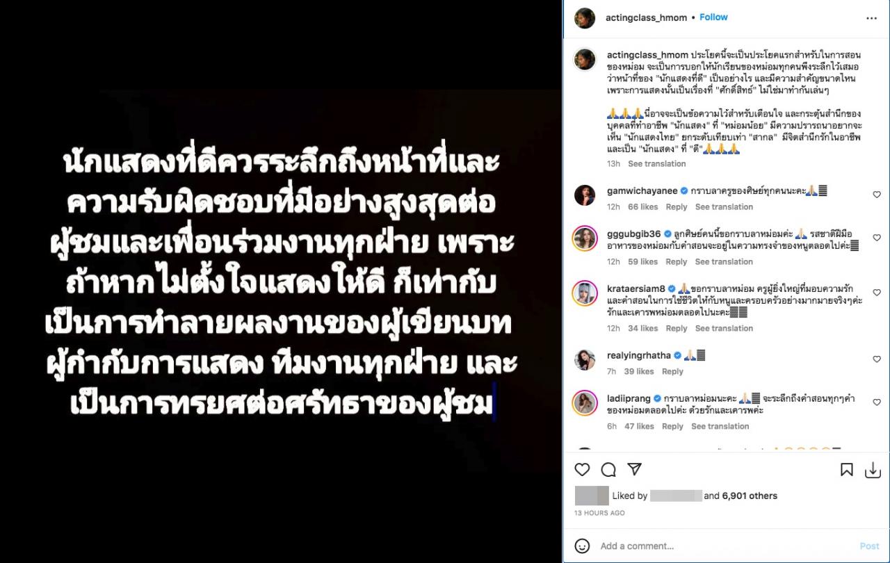 พร้อมทั้งเขียนแคปชั่น “ประโยคนี้จะเป็นประโยคแรกสำหรับในการสอนของหม่อม จะเป็นการบอกให้นักเรียนของหม่อมทุกคนพึงระลึกไว้เสมอ ว่าหน้าที่ของ "นักแสดงที่ดี" เป็นอย่างไร และมีความสำคัญขนาดไหน เพราะการแสดงนั้นเป็นเรื่องที่ "ศักดิ์สิทธิ์" ไม่ใช่มาทำกันเล่นๆ