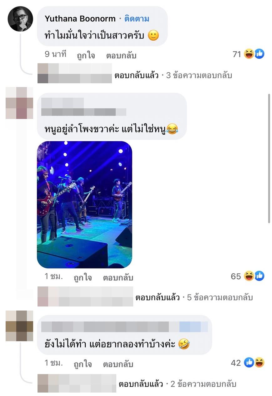 ท่ามกลางคอมเมนต์จากแฟนๆ อาทิ หนูอยู่ลำโพงขวาค่ะ แต่ไม่ใช่หนู, ผมเองครับเมื่อคืนใส่วิกผม, ตัวแทนหมู่บ้านมาก, มีอย่างนี้ด้วย, ใครทำเฮียหนู 55555555 ฯลฯ ด้าน ป๋าเต็ด ยุทธนา ก็แสดงความคิดเห็นสุดพีกว่า "ทำไมมั่นใจว่าเป็นสาวครับ".