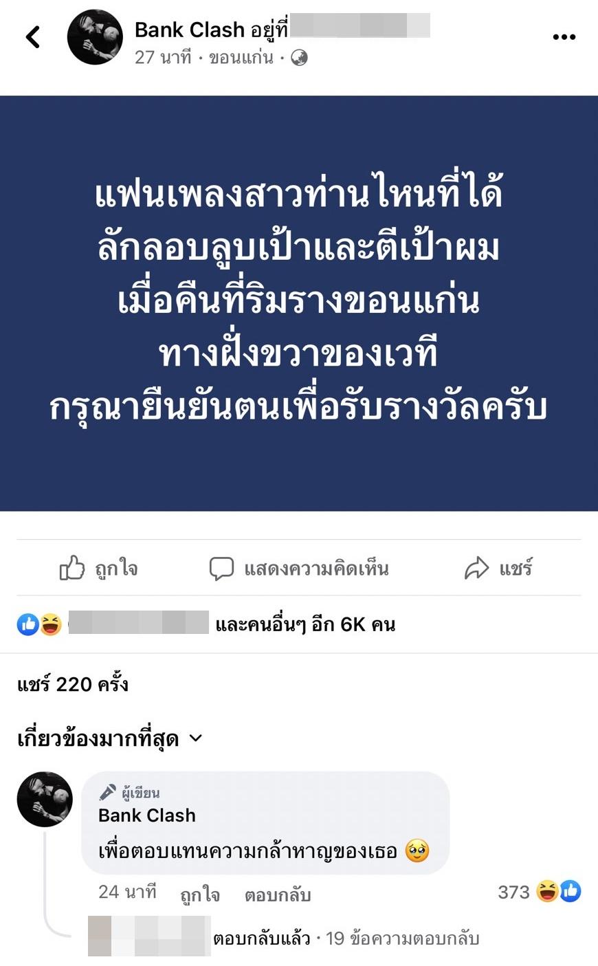 โดย แบงค์ แคลช โพสต์ข้อความในแฟนเพจ Bank Clash ไว้ว่า “แฟนเพลงสาวท่านไหนที่ได้ลักลอบลูบเป้าและตีเป้าผมเมื่อคืนที่ริมรางขอนแก่นทางฝั่งขวาของเวทีกรุณายืนยันตนเพื่อรับรางวัลครับ” และคอมเมนต์เพิ่มเติมว่า “เพื่อตอบแทนความกล้าหาญของเธอ”