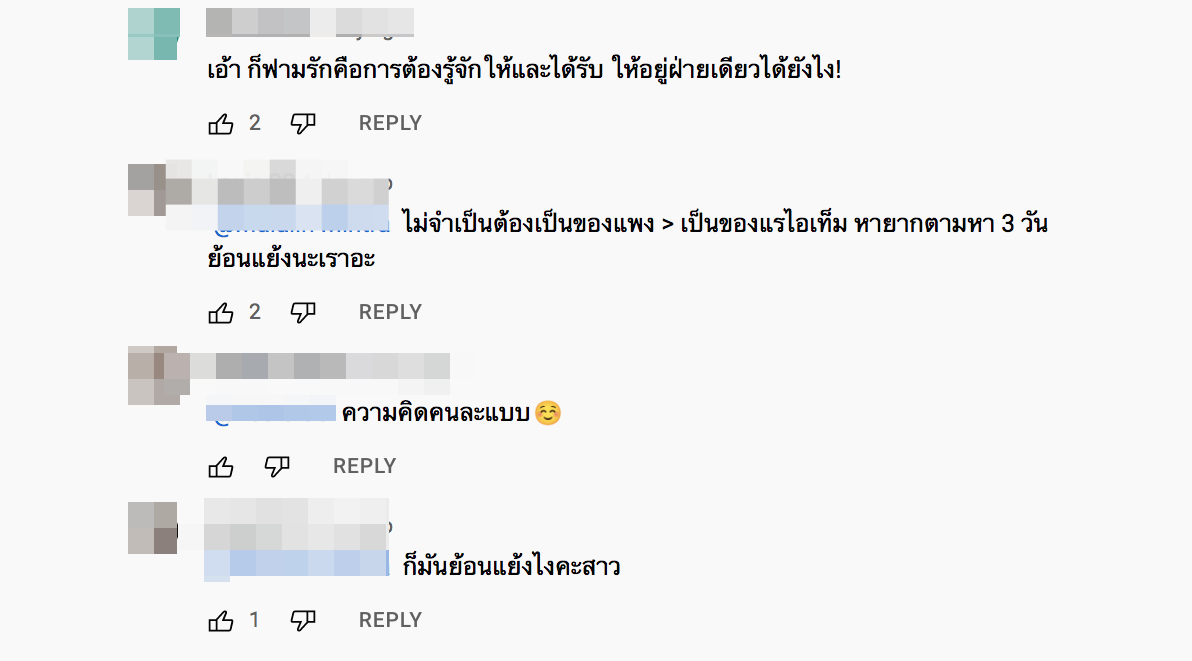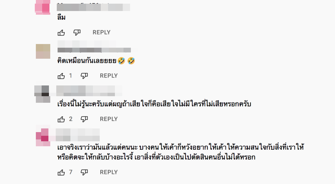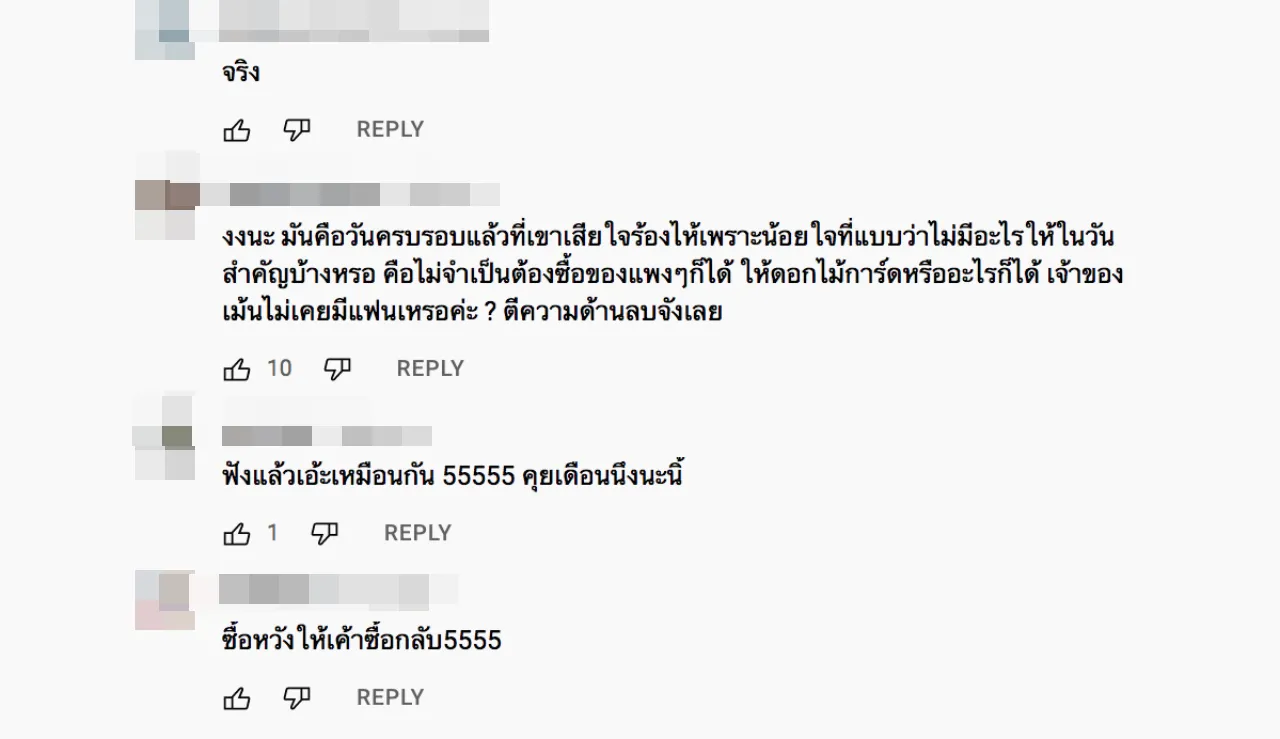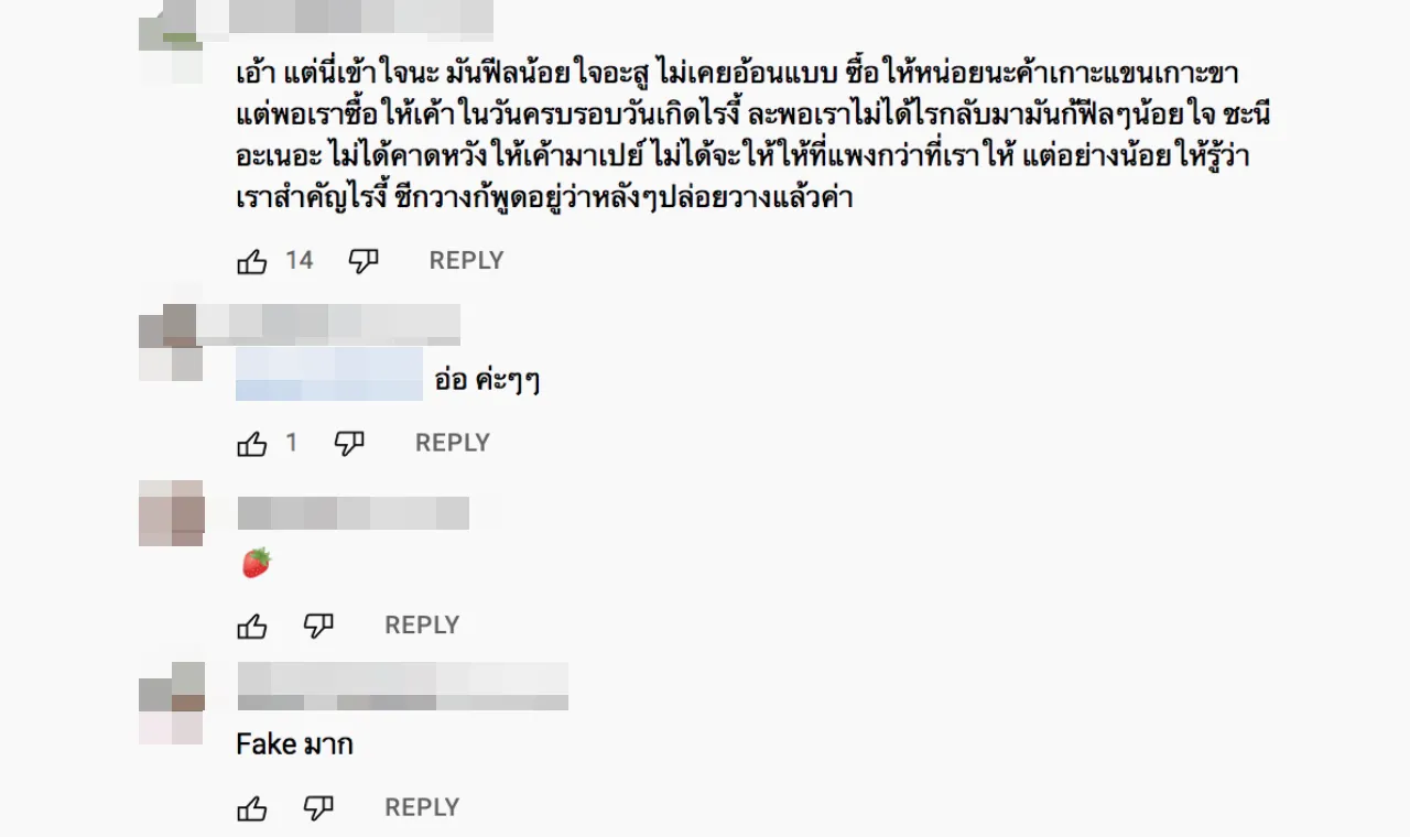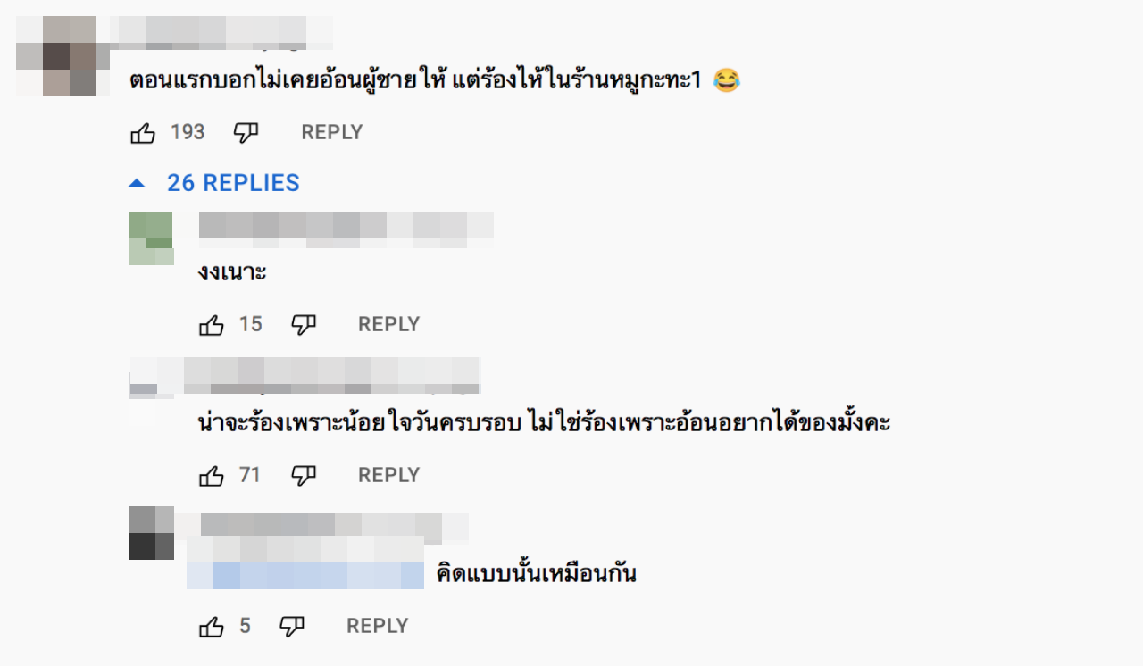 หลังจากที่คลิปดังกล่าวถูกเผยแพร่ไป ก็มีชาวเน็ตมาคอมเมนต์เพราะเกิดความสงสัยถึงกรณีที่ว่า "ตอนแรกบอกไม่เคยอ้อนผู้ชายให้ แต่ร้องไห้ในร้านหมูกระทะ 1, จริง ตอนคลิปบอกไม่เคยร้องขอว่าอยากได้ กลางคลิปเปิดรูปให้ดูเลอ งงมาก, ไม่ได้อ้อนอยากได้ของ = เปิดรูปแล้วถามว่าสวยไหม > ผช บอกว่าสวย ซื้อเลย > ร้องไห้...?, กำลังคิดอยู่ เจอคอมเมนต์นี้ ขำดังเลย"