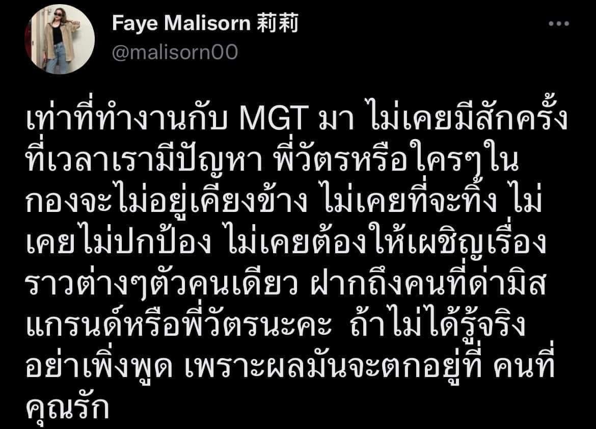 โดยระบุข้อความดังกล่าวว่า "เท่าที่ทำงานกับ MGT มา ไม่เคยมีสักครั้งที่เวลาเรามีปัญหาพี่วัตรหรือใครๆ ในกองจะไม่อยู่เคียงข้าง ไม่เคยที่จะทิ้ง ไม่เคยไม่ปกป้อง ไม่เคยต้องให้เผชิญเรื่องราวต่างๆ ตัวคนเดียว ฝากถึงคนที่ด่ามิสแกรนด์หรือพี่วัตรนะคะ ถ้าไม่ได้รู้จริงอย่าเพิ่งพูด เพราะผลมันจะตกอยู่ที่คนที่คุณรัก"