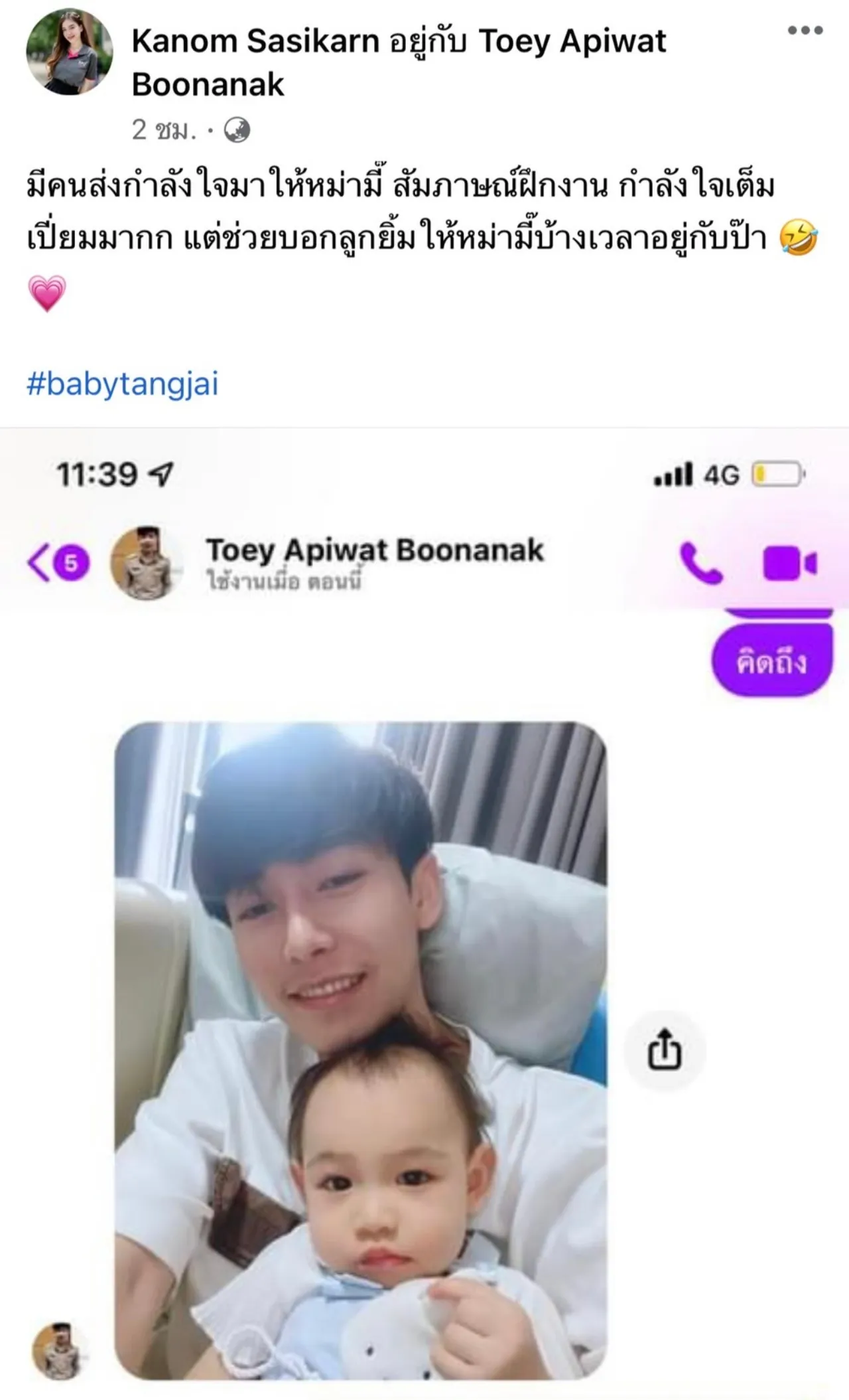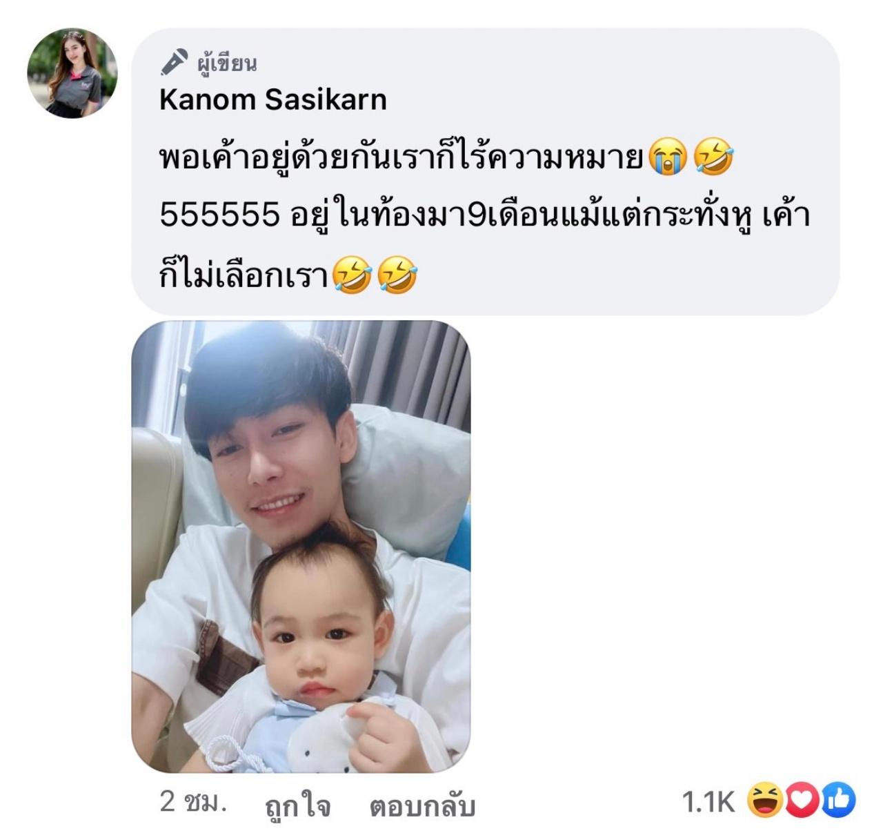 “มีคนส่งกำลังใจมาให้หม่ามี้ สัมภาษณ์ฝึกงาน กำลังใจเต็มเปี่ยมมากก แต่ช่วยบอกลูกยิ้มให้หม่ามี้บ้างเวลาอยู่กับป๊า” และยังโพสต์รูปลูกสาวกับพ่อ พร้อมข้อความตัดพ้อเบาๆ ว่า “พอเค้าอยู่ด้วยกันเราก็ไร้ความหมาย 55555 อยู่ในท้องมา 9 เดือน แม้แต่กระทั่งหู เค้าก็ไม่เลือกเรา”