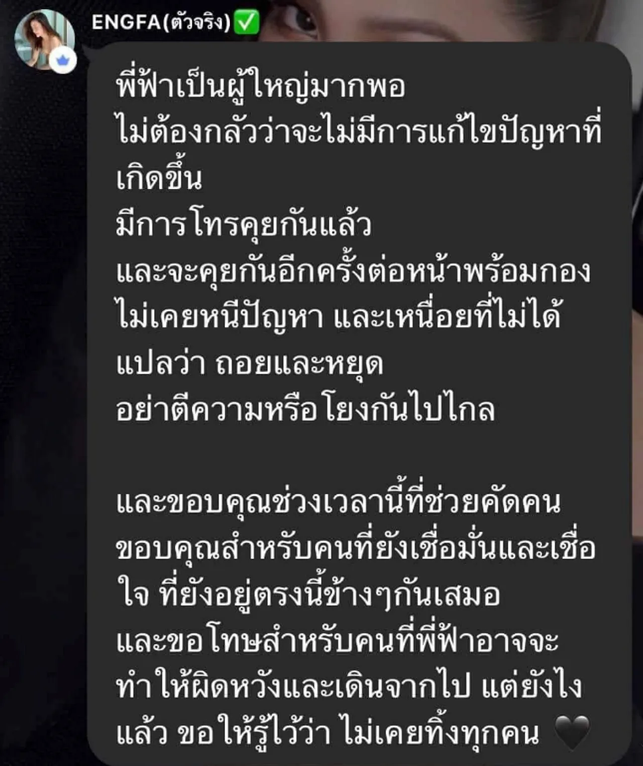 โดยระบุข้อความดังกล่าวว่า "พี่ฟ้าเป็นผู้ใหญ่มากพอ ไม่ต้องกลัวว่าจะไม่มีการแก้ไขปัญหาที่เกิดขึ้น มีการโทรคุยกันแล้วและจะคุยกันอีกครั้งต่อหน้าพร้อมกอง ไม่เคยหนีปัญหา และเหนื่อยที่ไม่ได้แปลว่าถอยและหยุด อย่าตีความหรือโยงกันไปไกล