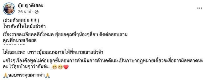 ก่อนที่ล่าสุด ยุ้ย ญาติเยอะ จะโพสต์เฟซบุ๊กส่วนตัวโดยระบุข้อความว่า "(ช่วยด้วยยยย!!!!!!) โทรศัพท์ไฟไหม้แล้วค่าเรื่องรายละเอียดคดีทั้งหมด ยุ้ยขอบคุณพี่ๆ น้องๆ สื่อฯ ติดต่อสอบถาม คุณพี่ทนายเกิดผล ได้เลยนะคะ เพราะยุ้ยมอบหมายให้พี่ทนายเขาแล้วจ้า #จริงๆเรื่องคือพูดไม่ค่อยถูกขั้นตอนการดำเนินการด้านคดีและ เป็นภาษากฎหมายเดี๋ยวจะสื่อสารผิดพลาดนะคะ ไว้คุยบ้านๆว่ากันจ่ะ..ขอบพระคุณมากค่า".