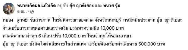 จนกระทั่ง ทนายเกิดผล แก้วเกิด ทนายประจำตัวของสาว ยุ้ย ญาติเยอะ ได้ออกมาโพสต์ข้อความระบุว่า "หยอง ลูกหยี รับสารภาพ ในชั้นพิจารณาของศาล จังหวัดนนทบุรี กรณีหมิ่นประมาท ยุ้ย ญาติเยอะ จำเลยรับสารภาพต่อศาลและวางเงิน บรรเทาความผิด 10,000 บาท ศาลพิพากษาจำคุก 6 เดือน ปรับ 10,000 บาท โทษจำคุกให้รอลงอาญา ยุ้ย ญาติเยอะ ยังติดใจค่าเสียหายในส่วนแพ่ง เตรียมฟ้องเรียกค่าเสียหาย 500,000 บาท"