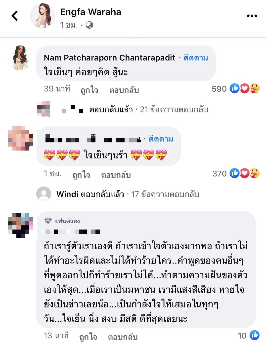 หลังจากนั้นก็มีเหล่าแฟนคลับและแฟนนางงามเข้ามาให้กำลังใจอย่างมากมาย เช่น "ถ้าเรารู้ตัวเราเองดี ถ้าเราเข้าใจตัวเองมากพอ ถ้าเราไม่ได้ทำอะไรผิดและไม่ได้ทำร้ายใคร..คำพูดของคนอื่นๆ ที่พูดออกไปก็ทำร้ายเราไม่ได้...ทำตามความฝันของตัวเองให้สุด...เมื่อเราเป็นมหาชน เรามีแสงสีเสียง หายใจยังเป็นข่าวเลยน้อ เป็นกำลังใจให้เสมอในทุกๆ วัน.. ..ใจเย็น นิ่ง สงบ มีสติ ดีที่สุดเลยนะ" เป็นต้น.