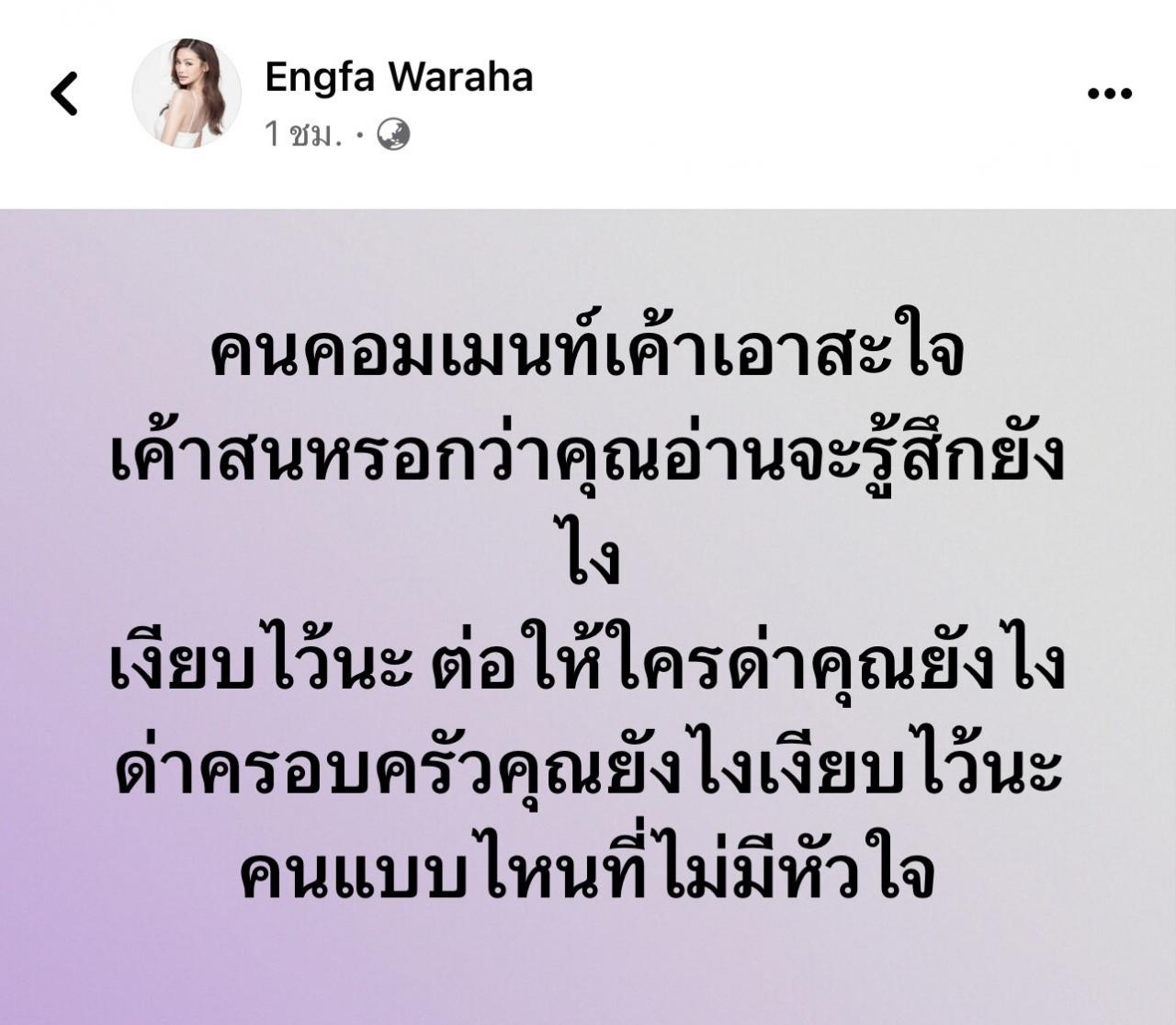 โดยระบุข้อความดังกล่าวว่า "คนคอมเมนท์เค้าเอาสะใจ เค้าสนหรอกว่าคุณอ่านจะรู้สึกยังไงเงียบไว้นะ ต่อให้ใครด่าคุณยังไงด่าครอบครัวคุณยังไงเงียบไว้นะ คนแบบไหนที่ไม่มีหัวใจ"