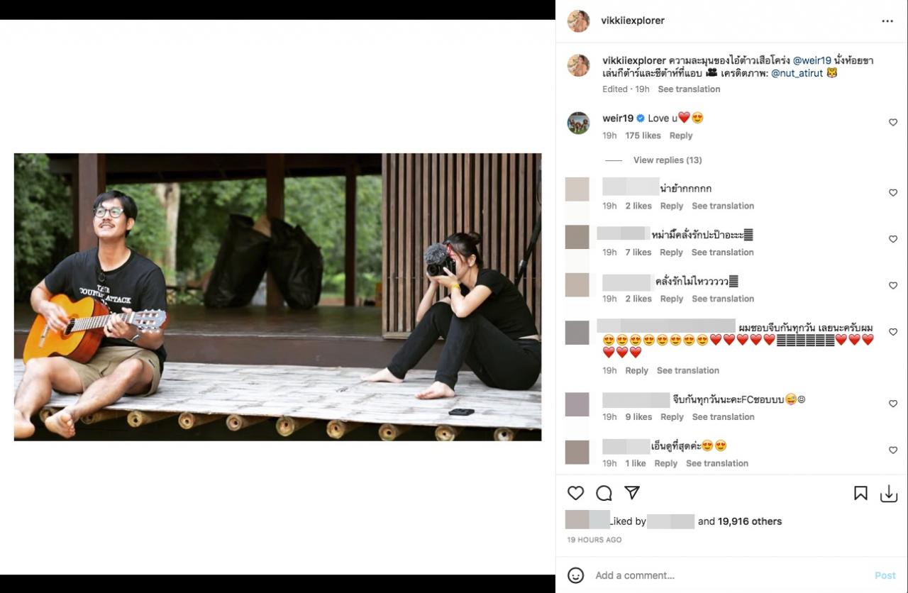 ท่ามกลางคอมเมนต์จากแฟนๆ ที่พร้อมใจแห่แซว อาทิ น่าย้ากกกกก, หม่ามี๊คลั่งรักปะป๊าอะะะ, คลั่งรักไม่ไหววววว, จีบกันทุกวันนะคะFCชอบบบ, เอ็นดูที่สุดค่ะ ฯลฯ ด้านคุณสามีอย่างหนุ่มเวียร์ก็แวะมาหยอดคำหวานสั้นๆ ถึงคุณภรรยาอย่างวิกกี้ว่า “Love u” ด้วย.