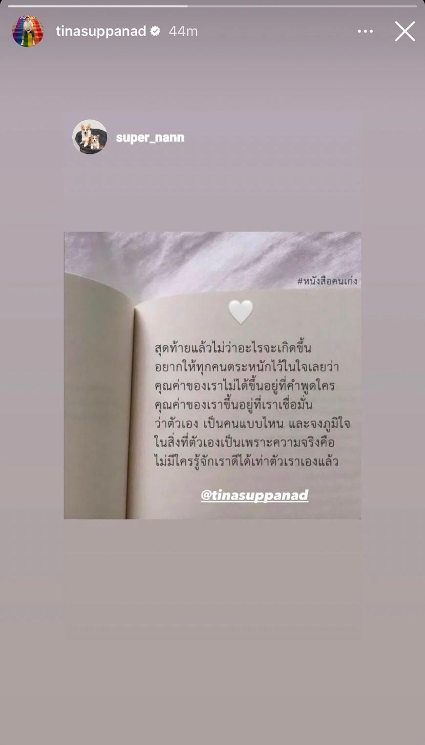 ซึ่งหลังจากที่เกิดเรื่องดังกล่าวขึ้น ล่าสุด ติ๊นา ศุภนาฏ ได้รีโพสต์ไอจีสตอรี่ของ @super_nann ที่โพสต์ภาพข้อความที่เขียนว่า “สุดท้ายแล้วไม่ว่าอะไรจะเกิดขึ้น อยากให้ทุกคนตระหนักไว้ในใจเลยว่า คุณค่าของเราไม่ได้ขึ้นอยู่ที่คำพูดใคร คุณค่าของเราขึ้นอยู่ที่เราเชื่อมั่นว่าตัวเองเป็นคนแบบไหน และจงภูมิใจในสิ่งที่ตัวเองเป็น เพราะความจริงคือไม่มีใครรู้จักเราดีได้เท่าตัวเราเองแล้ว” และแท็กไปที่ไอจีของติ๊นาด้วย.