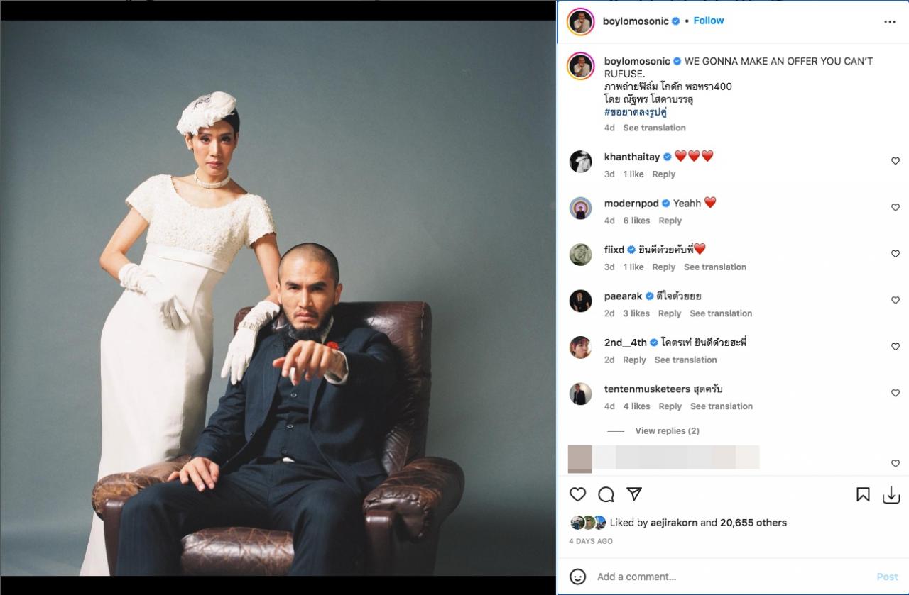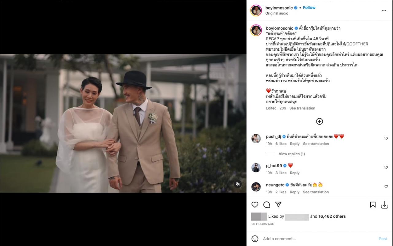 งานนี้เจ้าบ่าวหมาดๆ อย่าง บอย LOMOSONIC ก็ได้โพสต์คลิปบรรยากาศงานแต่งงานในแบบฉบับชาวร็อกลงในไอจีส่วนตัว และเขียนแคปชั่นถึงการเตรียมงานในวันสำคัญแบบนี้ว่า “ตั้งชื่อกรุ๊ปไลน์ที่คุยงานว่า “แต่ง/ระห่ำ/เดือด” RECAP ทุกอย่างที่เกิดขึ้นใน 45 วินาที ปาร์ตี้เจ้าพ่อ/ปฏิบัติการยื่นข้อเสนอที่ปฏิเสธไม่ได้/GODFTHER พยายามไม่ยืดเยื้อ ไม่บูชาตัวเองมาก