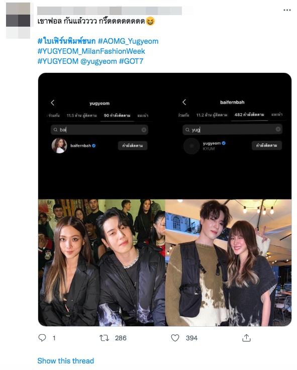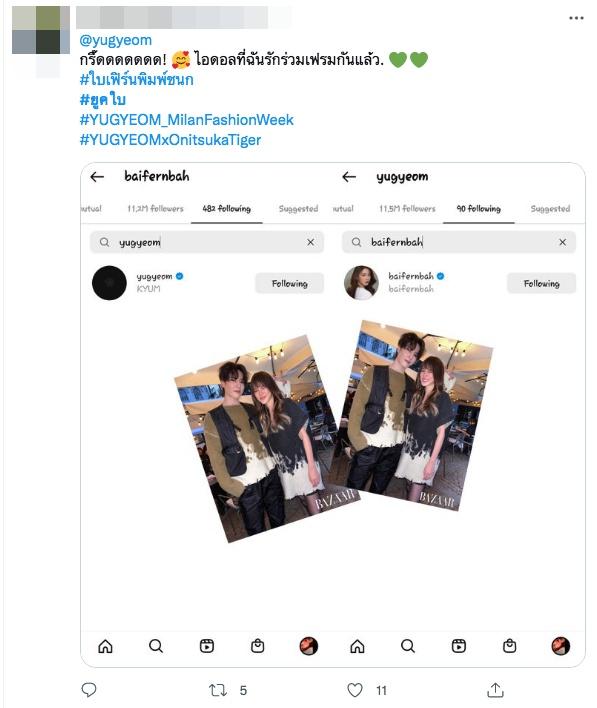 งานนี้นอกจากจะมีโมเมนต์น่ารักๆ เมื่อทั้งคู่ถ่ายรูปคู่กันหน้างาน จนทำเอาแฟนๆ ฟินไปแล้ว ล่าสุดแฟนๆ ของทั้งคู่ได้กรี๊ดกันอีกรอบ เมื่อพบว่าในอินสตาแกรมส่วนตัวทั้งของใบเฟิร์นและยูคยอมต่างฟอลโลว์ไอจีกันและกันเรียบร้อยแล้ว