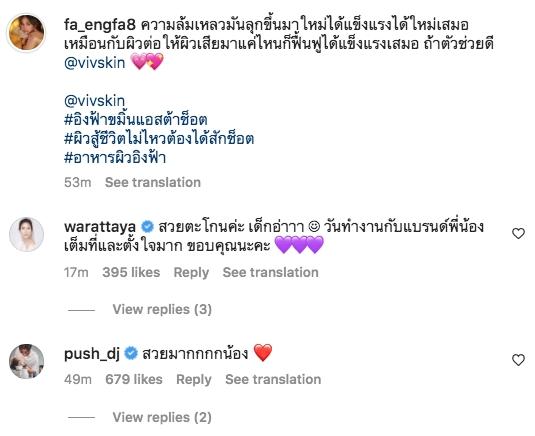 โดยสาว จุ๋ย ได้เขียนข้อความระบุไว้ว่า "สวยตะโกนค่ะ เด็กอ่าาา วันทำงานกับแบรนด์พี่น้องเต็มที่และตั้งใจมาก ขอบคุณนะคะ" ทางด้าน ดีเจพุฒ ก็มาคอมเมนต์ต่อว่า "สวยมากกกกน้อง" พร้อมกับอีโมจิรูปหัวใจ ทำเอาถูกใจเหล่าแฟนคลับด้อมอิงฟ้ากันรัวๆ.