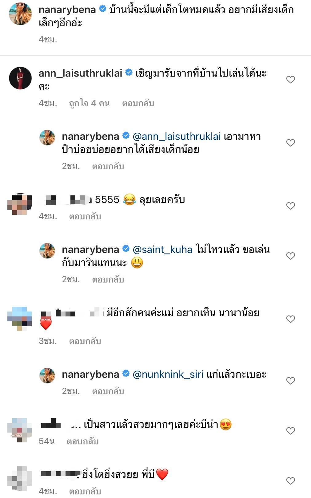 งานนี้นอกจากความสวยของน้องบีน่าแล้ว ชาวเน็ตดันไปโฟกัสบนแคปชั่นที่ แม่นานา ได้เขียนเอาไว้ว่า "อยากมีเสียงเด็กเล็กๆ อีกอ่ะ" เหมือนจะสื่อความหมายไปในทำนองที่ว่าอยากมีเบบี๋เพิ่ม ทำเอาคนเข้ามาแซวกันยกใหญ่ ว่าแต่ถ้าสามี เวย์ มาเห็นแบบนี้แล้วจะยังไงต่อ เตรียมจัดคนที่ 3 เลยมั้ยจ๊ะ.