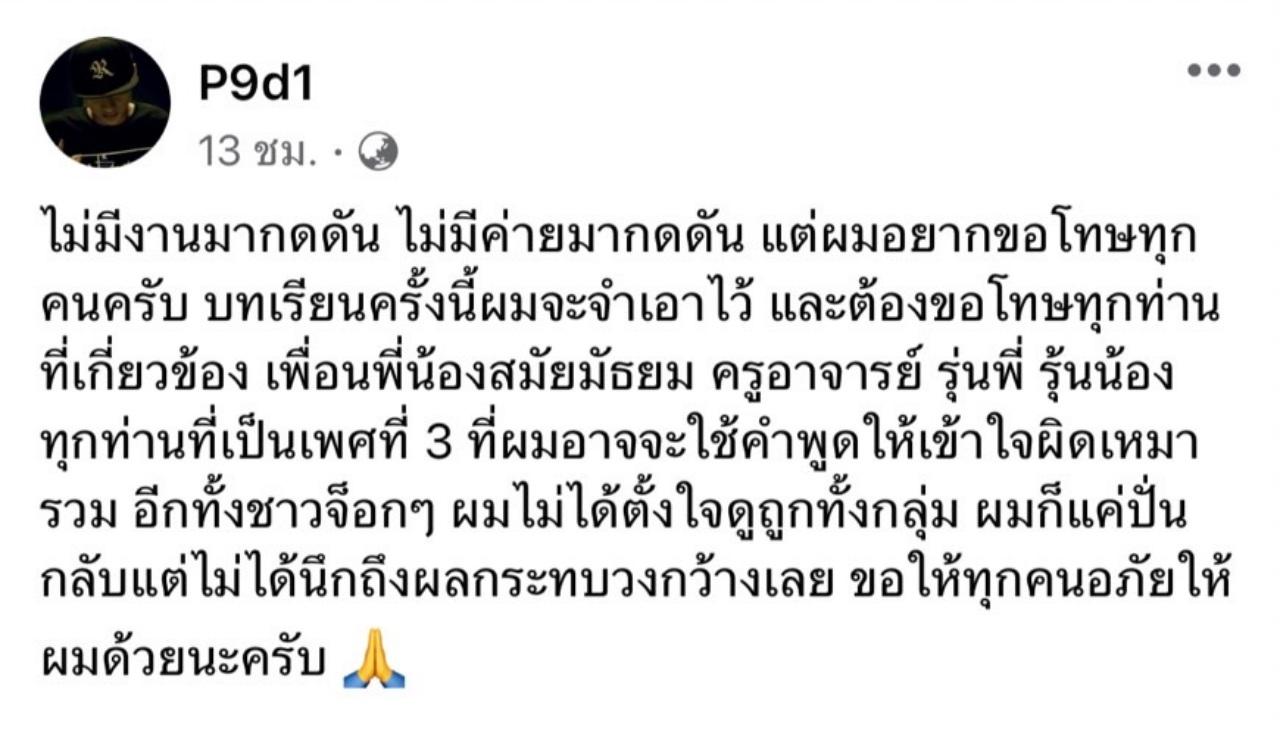 "ไม่มีงานมากดดัน ไม่มีค่ายมากดดัน แต่ผมอยากขอโทษทุกคนครับ บทเรียนครั้งนี้ผมจะจำเอาไว้ และต้องขอโทษทุกท่านที่เกี่ยวข้อง เพื่อนพี่น้องสมัยมัธยม ครูอาจารย์ รุ่นพี่ รุ้นน้อง ทุกท่านที่เป็นเพศที่ 3 ที่ผมอาจจะใช้คำพูดให้เข้าใจผิดเหมารวม อีกทั้งชาวจ๊อกๆ ผมไม่ได้ตั้งใจดูถูกทั้งกลุ่ม ผมก็แค่ปั่นกลับ แต่ไม่ได้นึกถึงผลกระทบวงกว้างเลย ขอให้ทุกคนอภัยให้ผมด้วยนะครับ"