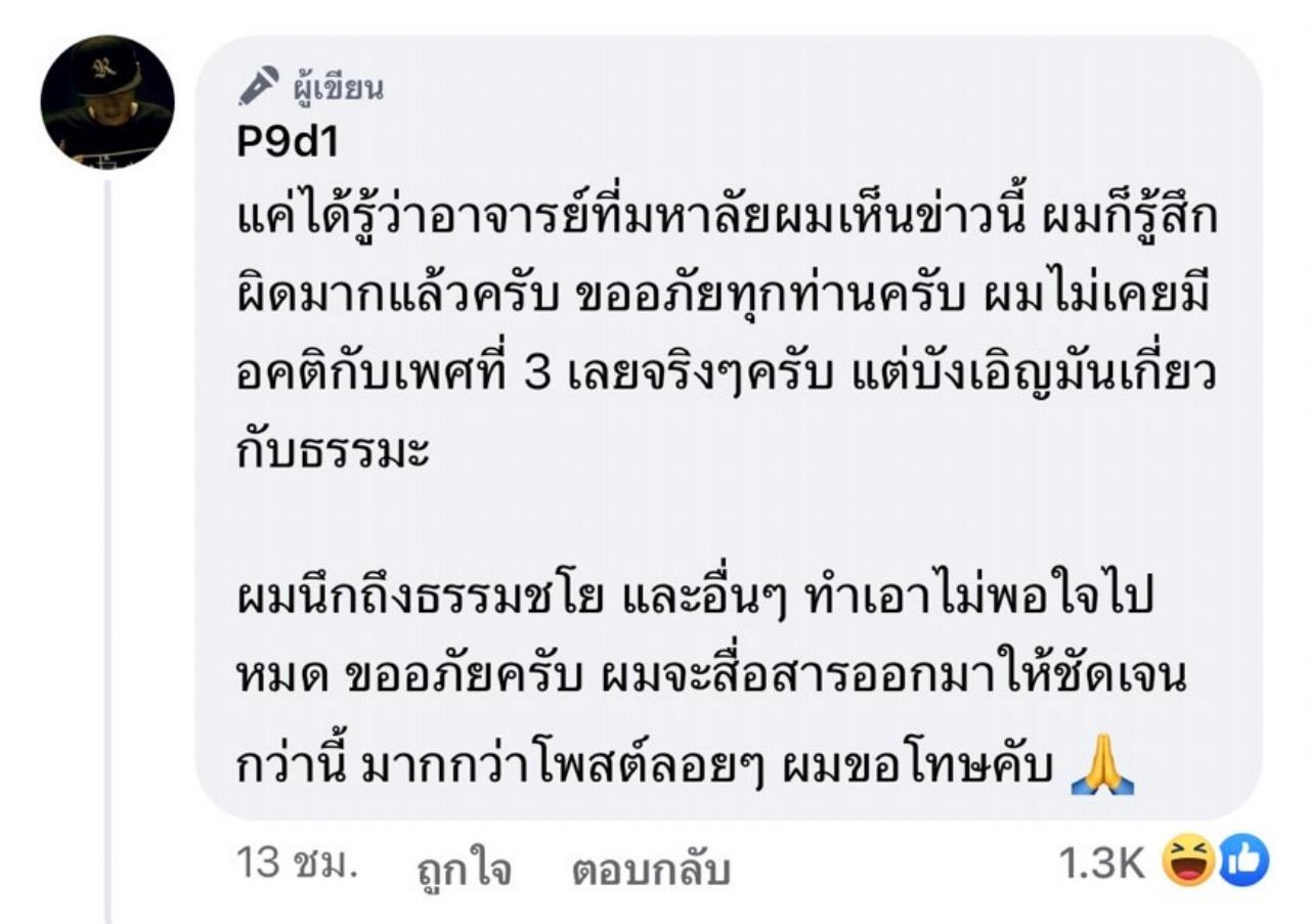 "แค่ได้รู้ว่าอาจารย์ที่มหา'ลัยผมเห็นข่าวนี้ ผมก็รู้สึกผิดมากแล้วครับ ขออภัยทุกท่านครับ ผมไม่เคยมีอคติกับเพศที่ 3 เลยจริงๆ ครับ แต่บังเอิญมันเกี่ยวกับธรรมะ ผมนึกถึงธรรมชโย และอื่นๆ ทำเอาไม่พอใจไปหมด ขออภัยครับ ผมจะสื่อสารออกมาให้ชัดเจนกว่านี้ มากกว่าโพสต์ลอยๆ ผมขอโทษคับ"