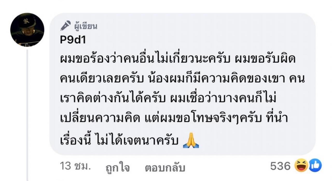 "ผมขอร้องว่าคนอื่นไม่เกี่ยวนะครับ ผมขอรับผิดคนเดียวเลยครับ น้องผมก็มีความคิดของเขา คนเราคิดต่างกันได้ครับ ผมเชื่อว่าบางคนก็ไม่เปลี่ยนความคิด แต่ผมขอโทษจริงๆ ครับ ที่นำเรื่องนี้ ไม่ได้เจตนาครับ" หลังจากที่ P9D ได้โพสต์ขอโทษ ก็มีหลายคนเข้ามาวิจารณ์ และติติงถึงสิ่งที่เจ้าตัวได้กระทำกันเป็นจำนวนมาก.
