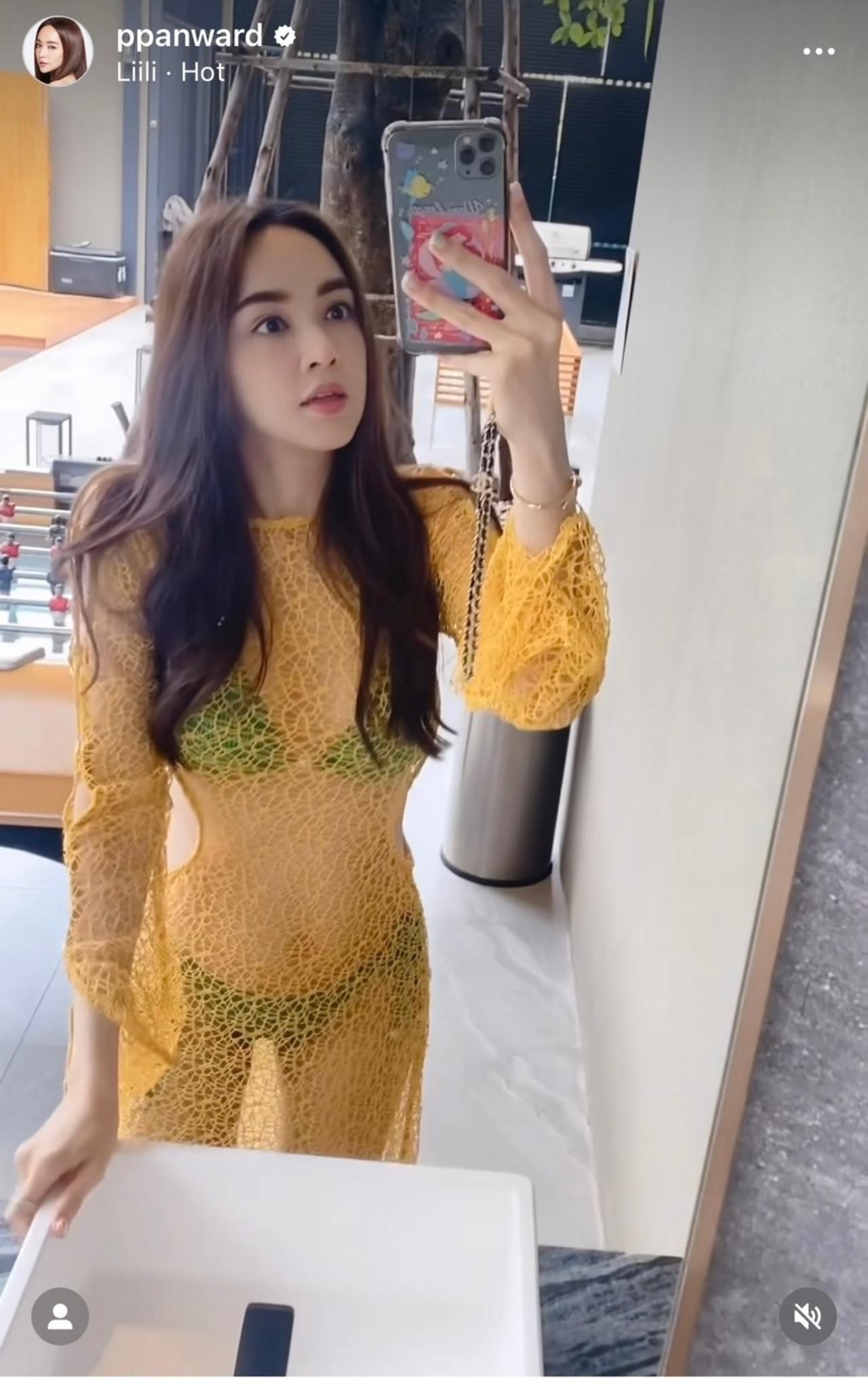 โดย เป้ย ปานวาด ได้ใส่ชุดบิกินีสีเขียวที่ใส่แล้วตัดกับสีผิวขาวโอโม่ พร้อมกับใส่ชุดตาข่ายสีเหลืองถ่ายคลิปตัวเองที่หน้ากระจก ซึ่งเผยให้เห็นความหุ่นดีของแม่ลูก 2 ว่ายังเซ็กซี่และแซ่บอยู่เสมอ
