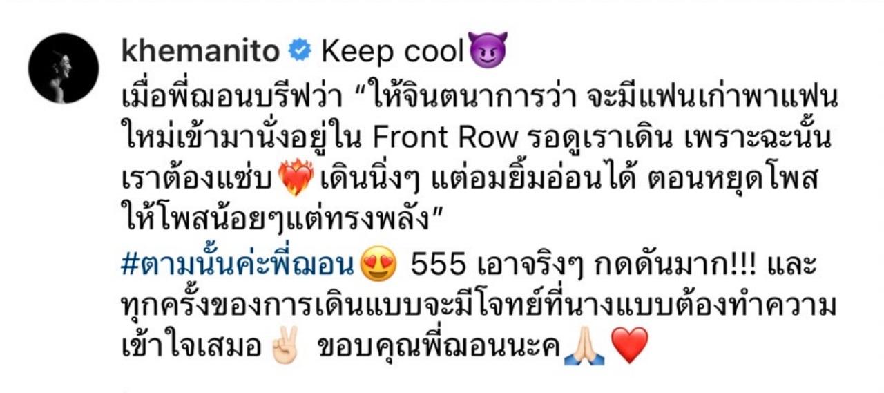 ล่าสุด แพนเค้ก ได้เผยภาพตัวเองที่อยู่บนรันเวย์ พร้อมเขียนเล่าเบื้องหลังของการเดินแบบสุดจึ้งนี้ บอกว่า