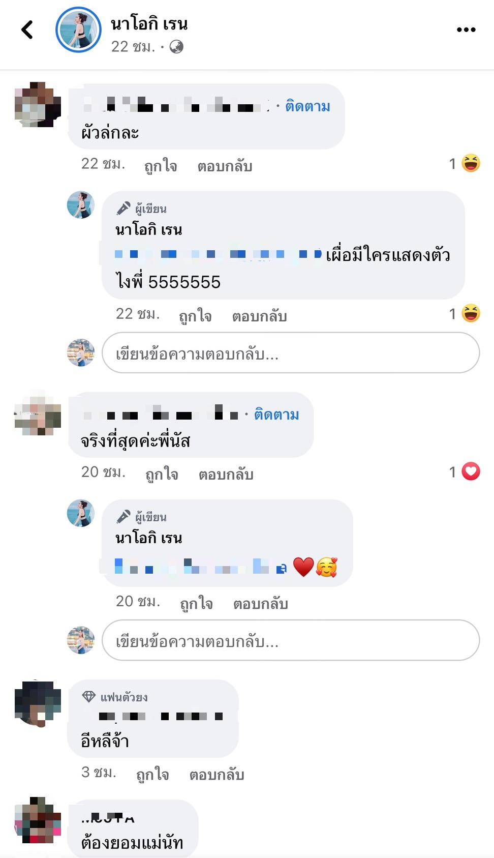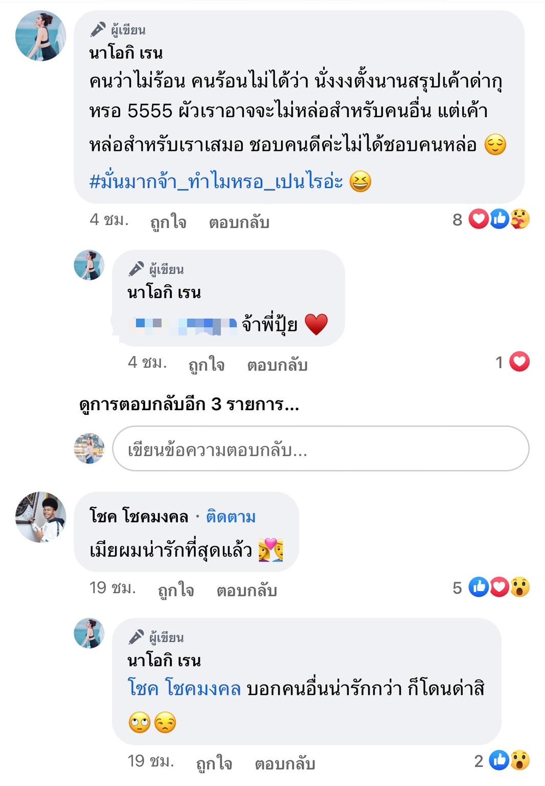 ก่อนที่เธอจะคอมเมนต์ใต้โพสต์ตัวเองต่อว่า "คนว่าไม่ร้อน คนร้อนไม่ได้ว่า นั่งงงตั้งนานสรุปเค้าด่ากุหรอ 5555 ผัวเราอาจจะไม่หล่อสำหรับคนอื่น แต่เค้าหล่อสำหรับเราเสมอ ชอบคนดีค่ะไม่ได้ชอบคนหล่อ #มั่นมากจ้า_ทำไมหรอ_เปนไรอ่ะ" ซึ่งก็ไม่รู้ข้อความดังกล่าวที่เธอโพสต์นั้นหมายถึงใคร หรือจะสื่อถึงอะไร