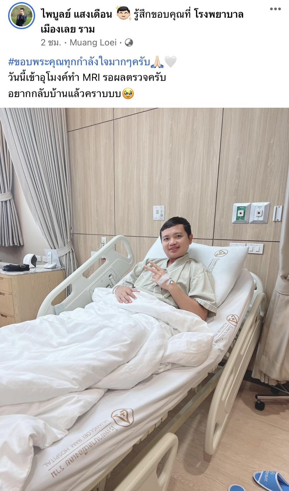 เกิดอาการปวดชาซีกซ้าย ถึงขั้นต้องหามตัวส่งโรงพยาบาลเมืองเลย กลางดึกของเมื่อคืน (27 กันยายน 2565) สำหรับ ครูไพบูลย์ แสงเดือน เจ้าของค่ายเพลง สามีของนักร้องสาวชื่อดัง กระต่าย พรรณนิภา โดย ครูไพบูลย์ ได้ออกมาโพสต์ผ่านเฟซบุ๊กส่วนตัว เป็นภาพขณะนอนอยู่ในโรงพยาบาล