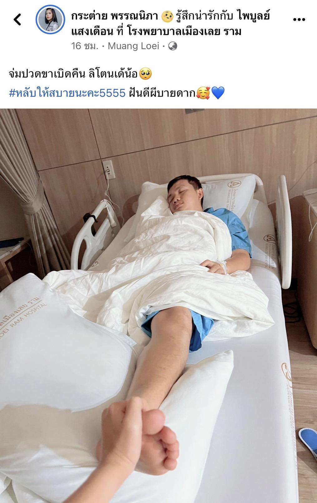 ด้านแฟนสาว กระต่าย ยังคอยดูแลไม่ห่าง พร้อมกับโพสต์ภาพสามีและแคปชั่นลงบนเฟซบุ๊กส่วนตัวว่า "จ่มปวดขาเบิดคืน ลิโตนเด้น้อ #หลับให้สบายนะคะ5555 ฝันดีผีบายดาก"