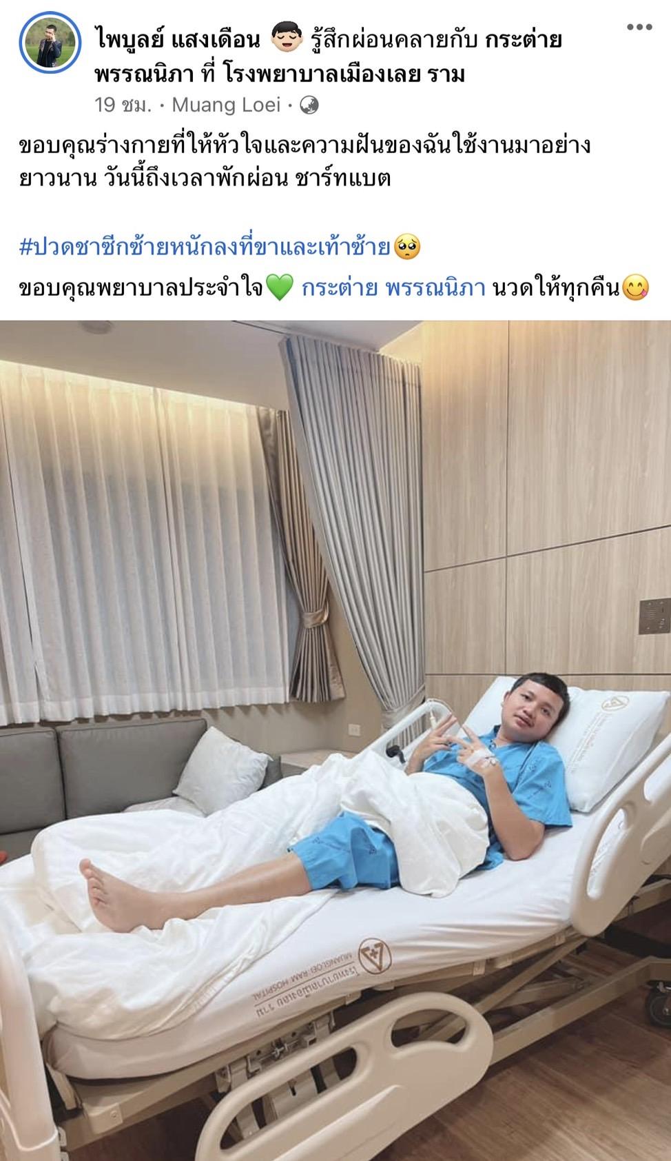 พร้อมกับระบุข้อความว่า "ขอบคุณร่างกายที่ให้หัวใจและความฝันของฉันใช้งานมาอย่างยาวนาน วันนี้ถึงเวลาพักผ่อน ชาร์ทแบต #ปวดชาซีกซ้ายหนักลงที่ขาและเท้าซ้าย ขอบคุณพยาบาลประจำใจ กระต่าย พรรณนิภา นวดให้ทุกคืน"