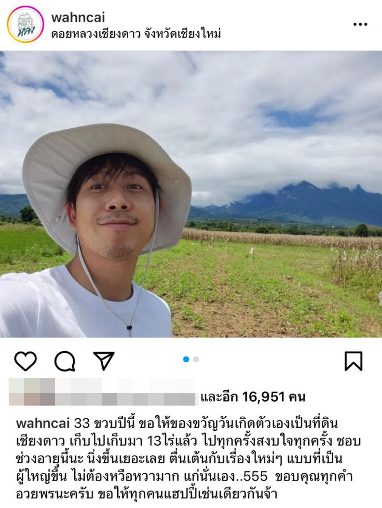 "33 ขวบปีนี้ ขอให้ของขวัญวันเกิดตัวเองเป็นที่ดินเชียงดาว เก็บไปเก็บมา 13 ไร่แล้ว ไปทุกครั้งสงบใจทุกครั้ง ชอบช่วงอายุนี้นะ นิ่งขึ้นเยอะเลย ตื่นเต้นกับเรื่องใหม่ๆ แบบที่เป็นผู้ใหญ่ขึ้น ไม่ต้องหวือหวามาก แก่นั่นเอง..555 ขอบคุณทุกคำอวยพรนะครับ ขอให้ทุกคนแฮปปี้เช่นเดียวกันจ้า".