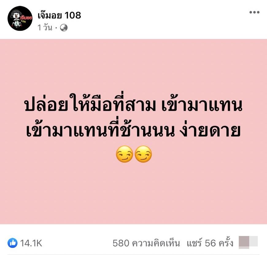 โดยเพจ เจ๊มอย 108 โพสต์ข้อความว่า “ปล่อยให้มือที่สาม เข้ามาแทน เข้ามาแทนที่ช้านนน ง่ายดาย” พร้อมทั้งใส่อีโมจิยิ้มมีเลศนัย ซึ่งข้อความที่โพสต์เป็นเนื้อเพลง “มือที่ 3” ที่ร้องโดย ทัช ณ ตะกั่วทุ่ง