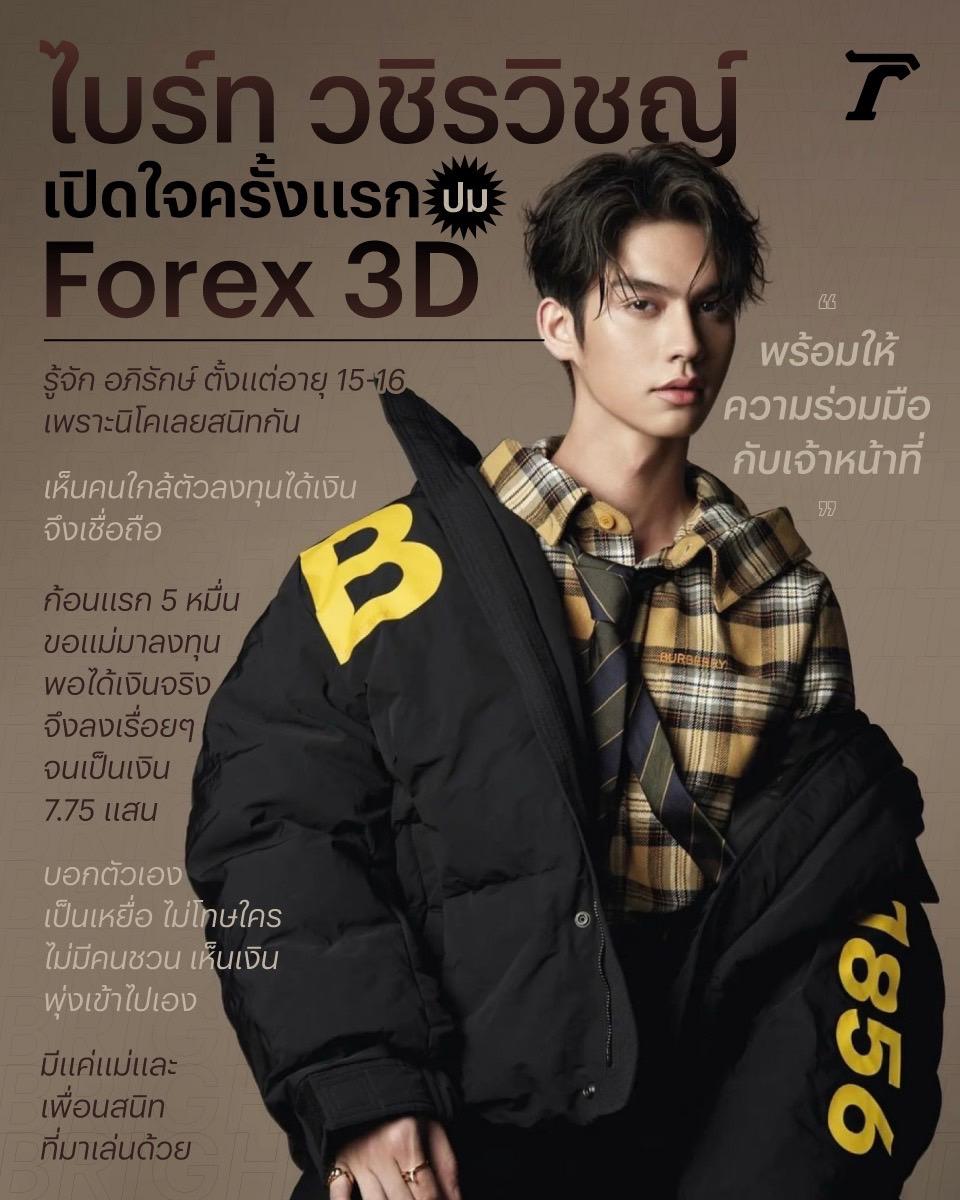 หลังจากที่มีเพจ รวบรวมผู้โดนโกง จาก Forex 3d แชร์คลิปรวมไปถึงภาพความสนิทสนมระหว่างพระเอกหนุ่มซีรีส์วาย ไบร์ท วชิรวิชญ์ ชีวอารี กับ อภิรักษ์ โกฎธิ CEO ของแชร์ลูกโซ่ Forex-3D ที่กลายเป็นคดีดังในเวลานี้ จนหลายคนสงสัยว่าไบร์ทมีส่วนเกี่ยวข้องกับกรณี Forex-3D หรือไม่ มีการชักชวนให้คนมาลงทุนกับ Forex-3D หรือเปล่า ล่าสุด ไบร์ท วชิรวิชญ์ เปิดใจกับรายการ “วันบันเทิง” ทางช่อง One 31 ถึงเรื่องดังกล่าว