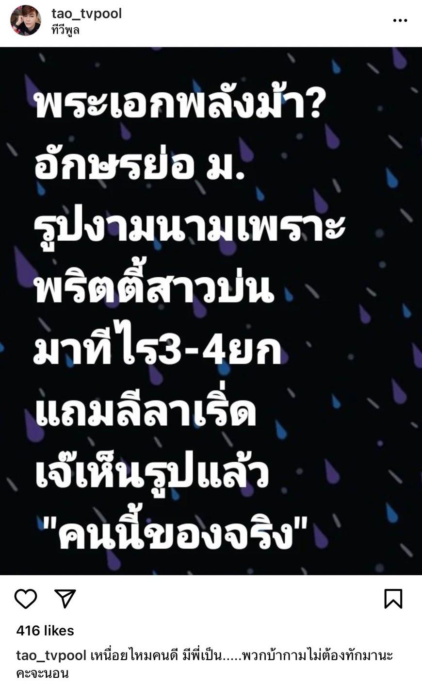 โดย เต๋า ทีวีพูล โพสต์ภาพข้อความที่เขียนว่า “พระเอกพลังม้า? อักษรย่อ ม. รูปงามนามเพราะพริตตี้สาวบ่น มาทีไร 3-4 ยก แถมลีลาเริ่ด เจ๊เห็นรูปแล้ว คนนี้ของจริง” และเขียนแคปชั่น “เหนื่อยไหมคนดี มีพี่เป็น.....พวกบ้ากามไม่ต้องทักมานะคะจะนอน”