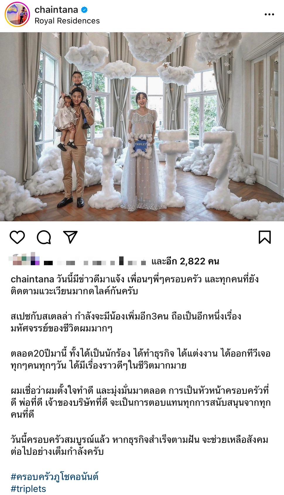 ผมเชื่อว่าผมตั้งใจทำดี และมุ่งมั่นมาตลอด การเป็นหัวหน้าครอบครัวที่ดี พ่อที่ดี เจ้าของบริษัทที่ดี จะเป็นการตอบแทนทุกการสนับสนุนจากทุกคนที่ดี วันนี้ครอบครัวสมบูรณ์แล้ว หากธุรกิจสำเร็จตามฝัน จะช่วยเหลือสังคมต่อไปอย่างเต็มกำลังครับ #ครอบครัวภูโชคอนันต์ #triplets"
